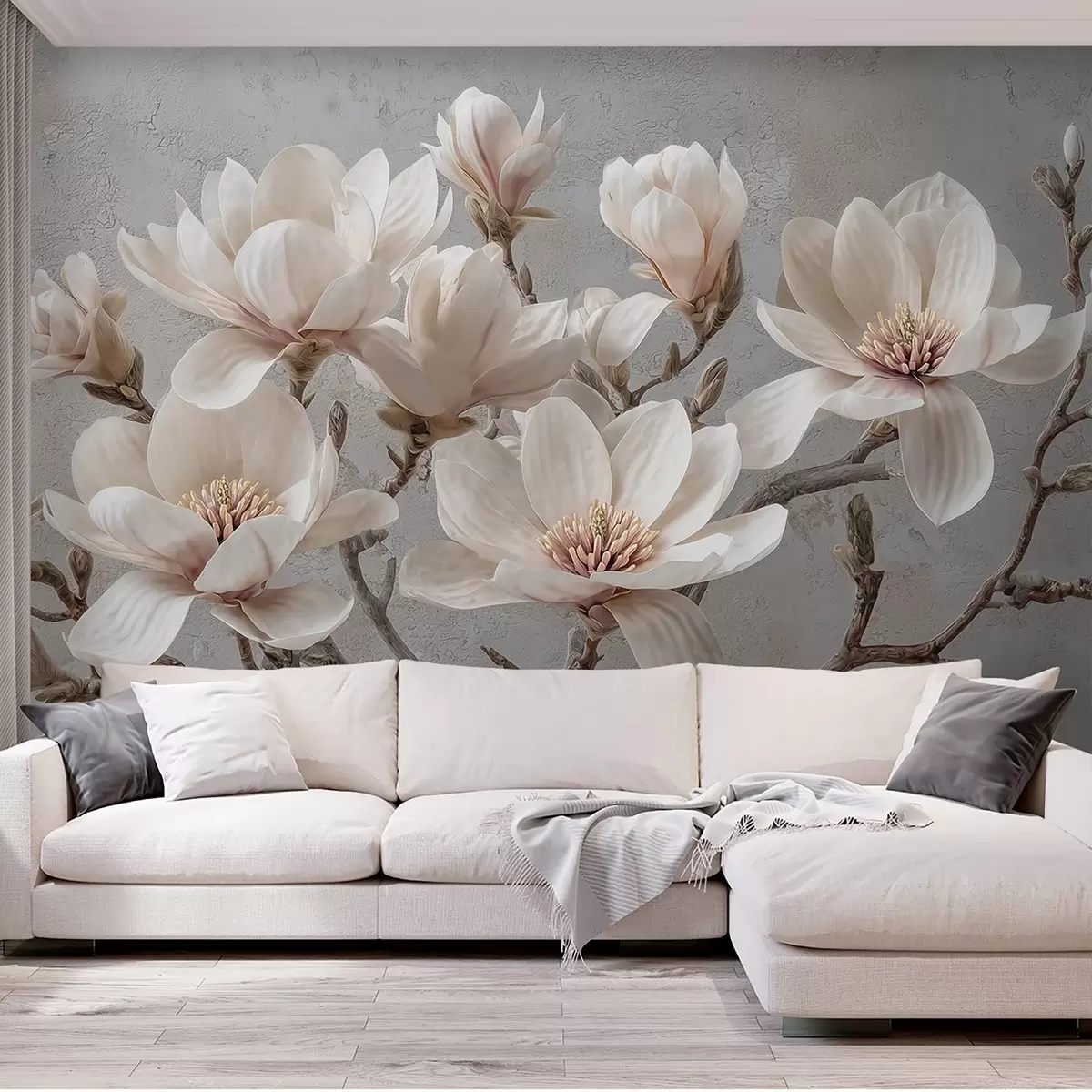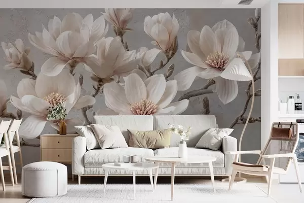 Valokuvatapetti Magnolian oksat, joissa on suuret vaaleat kukat mykistetyissä sävyissä Nr w09305