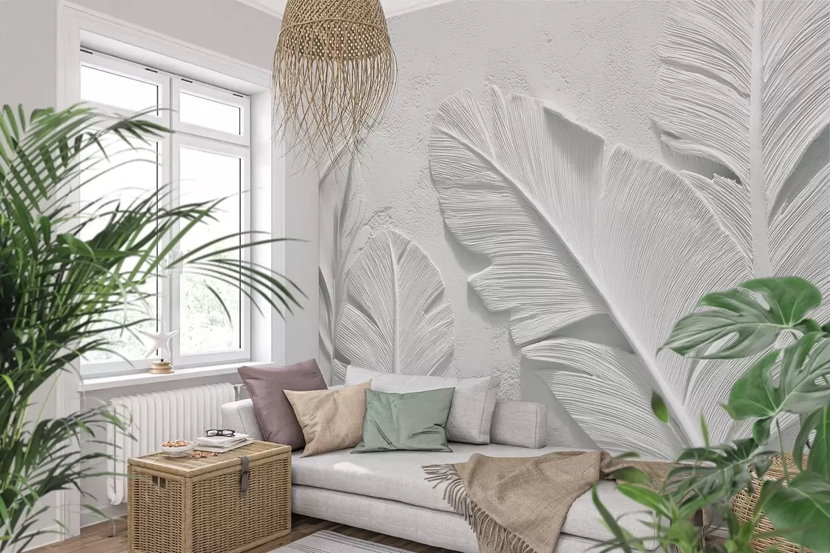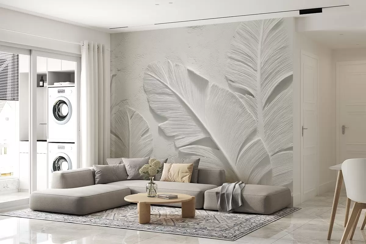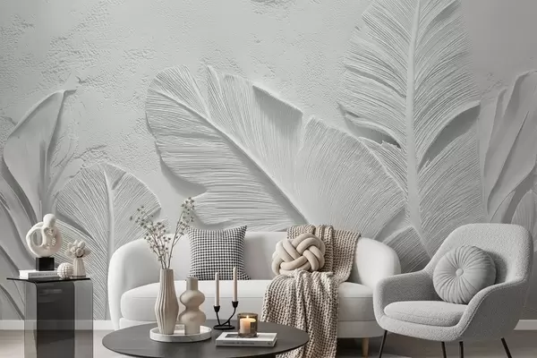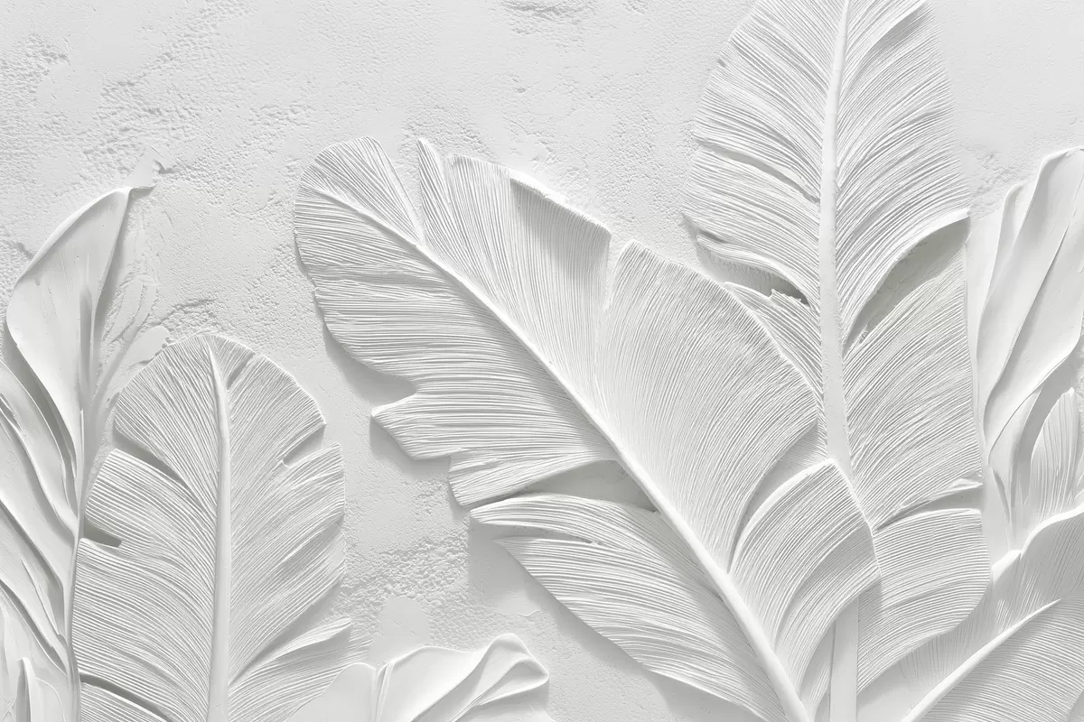 Valokuvatapetti Teksturoidut harmaat lehdet taustalla, jossa on faux kipsireliefi Nr w09307