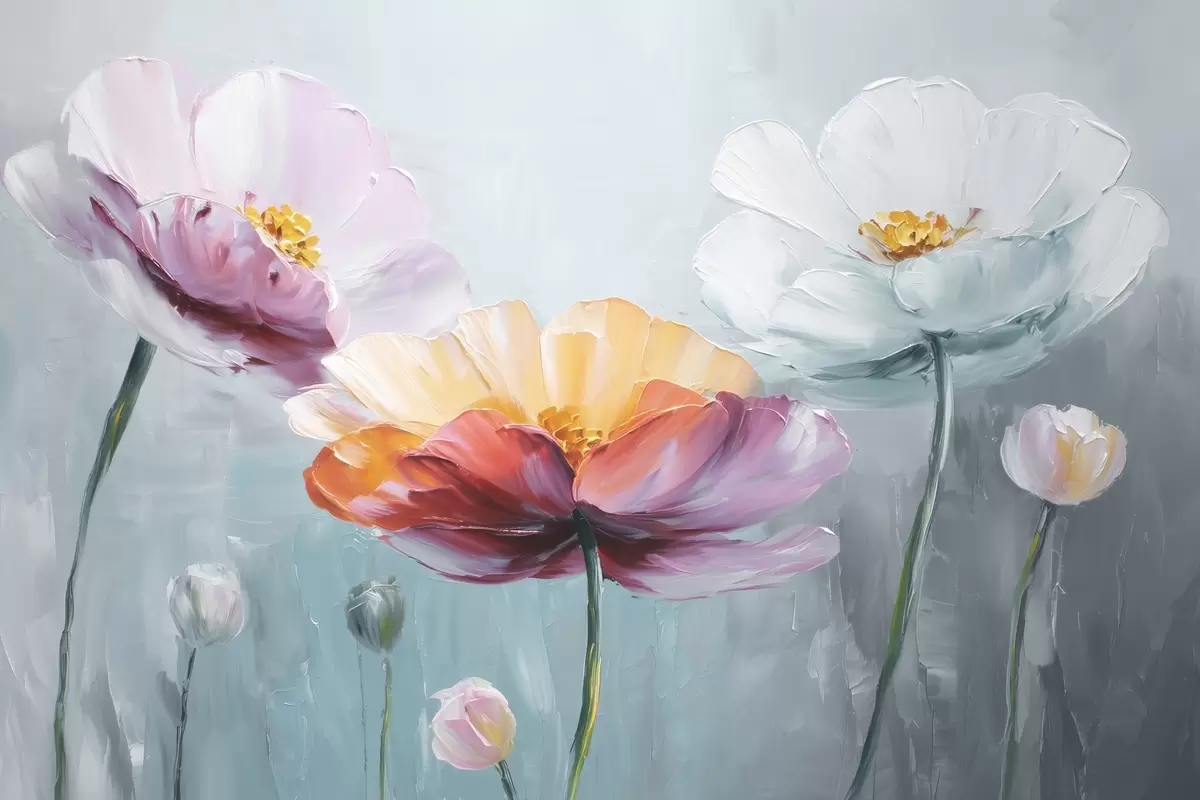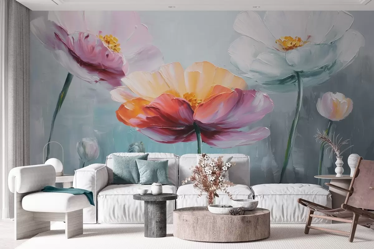 Valokuvatapetti Kirkkaita kukkia öljymaalaus tekniikka sininen tausta Nr w09310