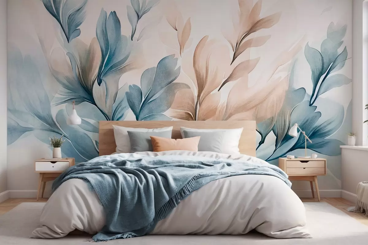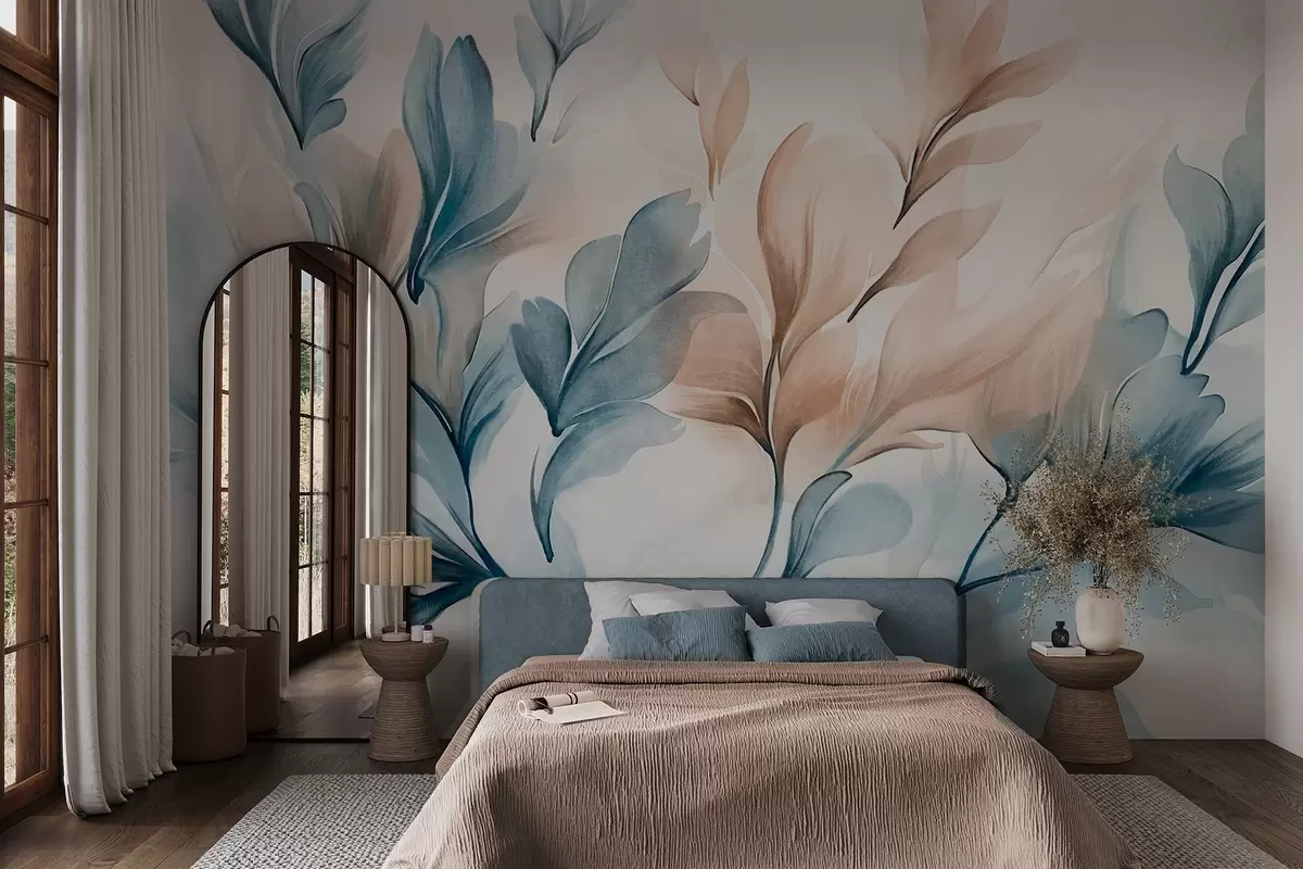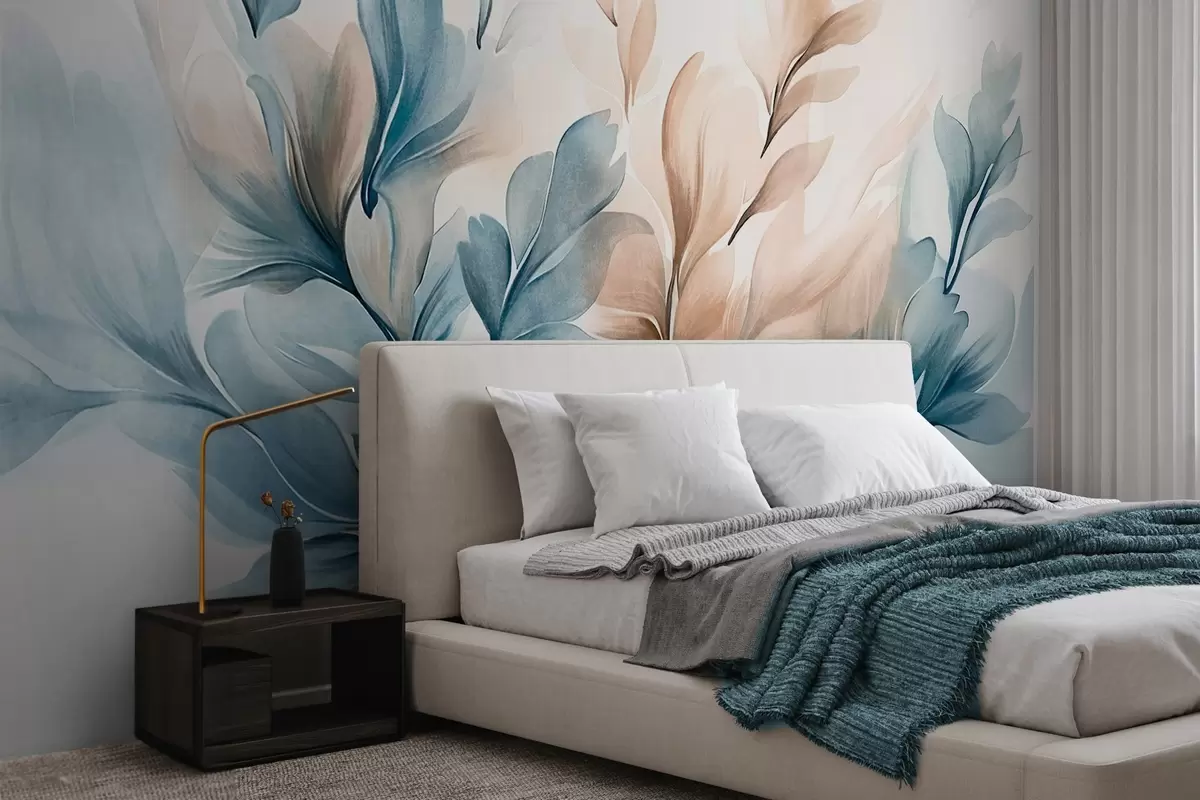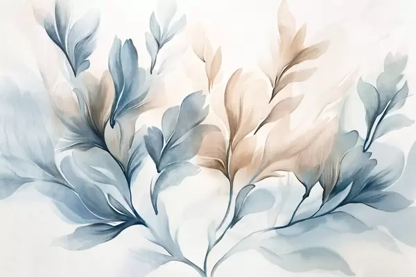 Valokuvatapetti Sininen ja ruskea abstrakti lehdet näkyvät siveltimenvedot , kevyt ja kuvioitu, pehmeä väripaletti, vesiväriefekti Nr w09313