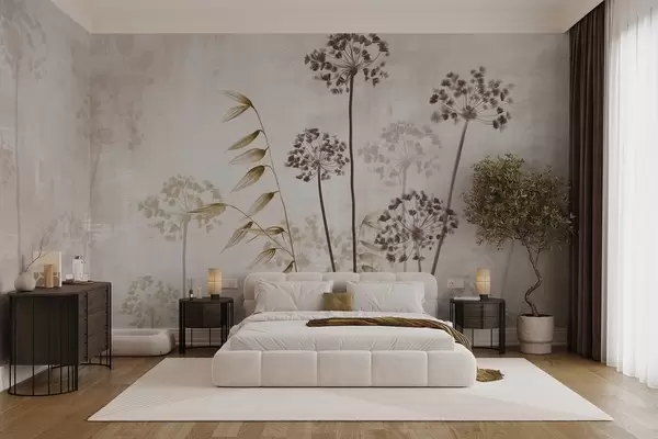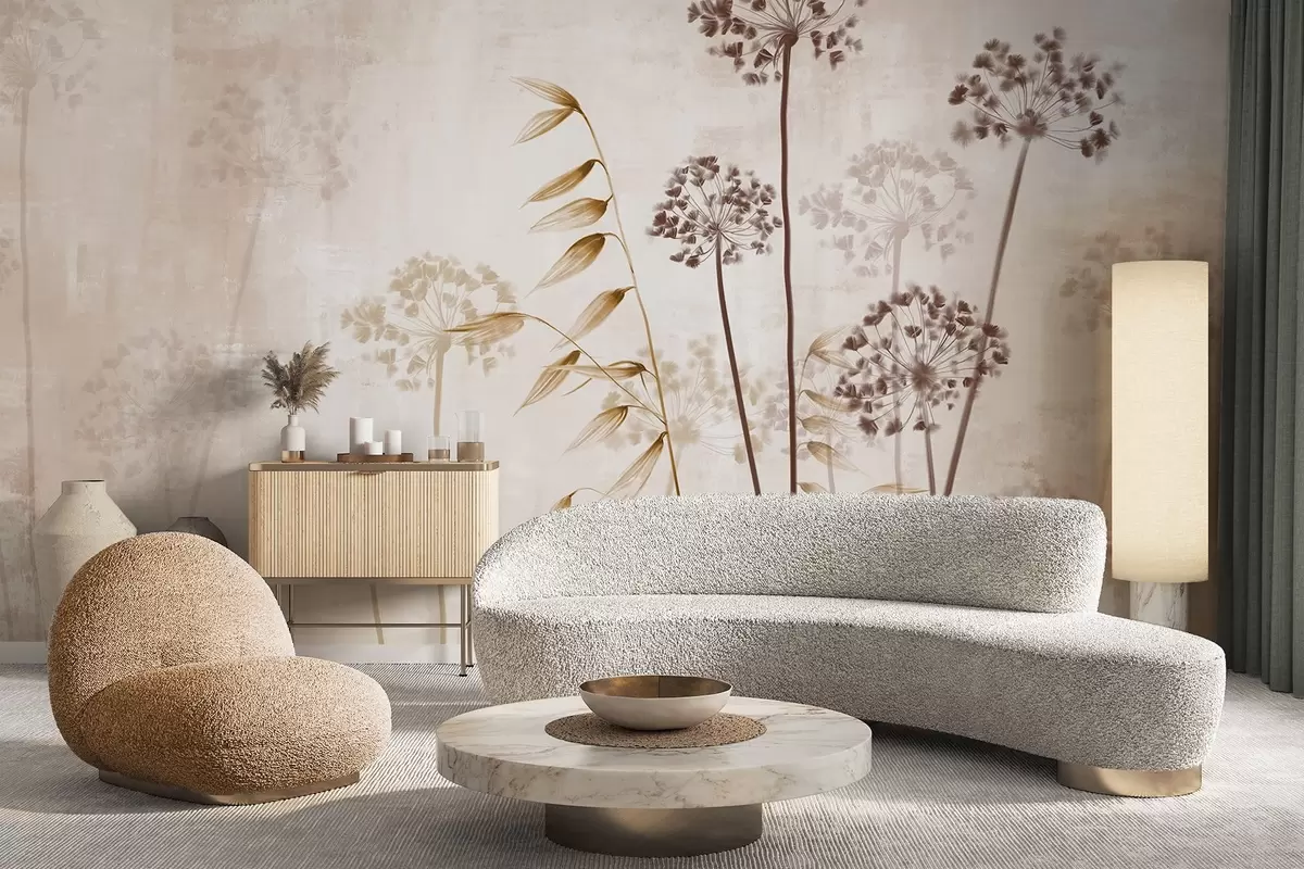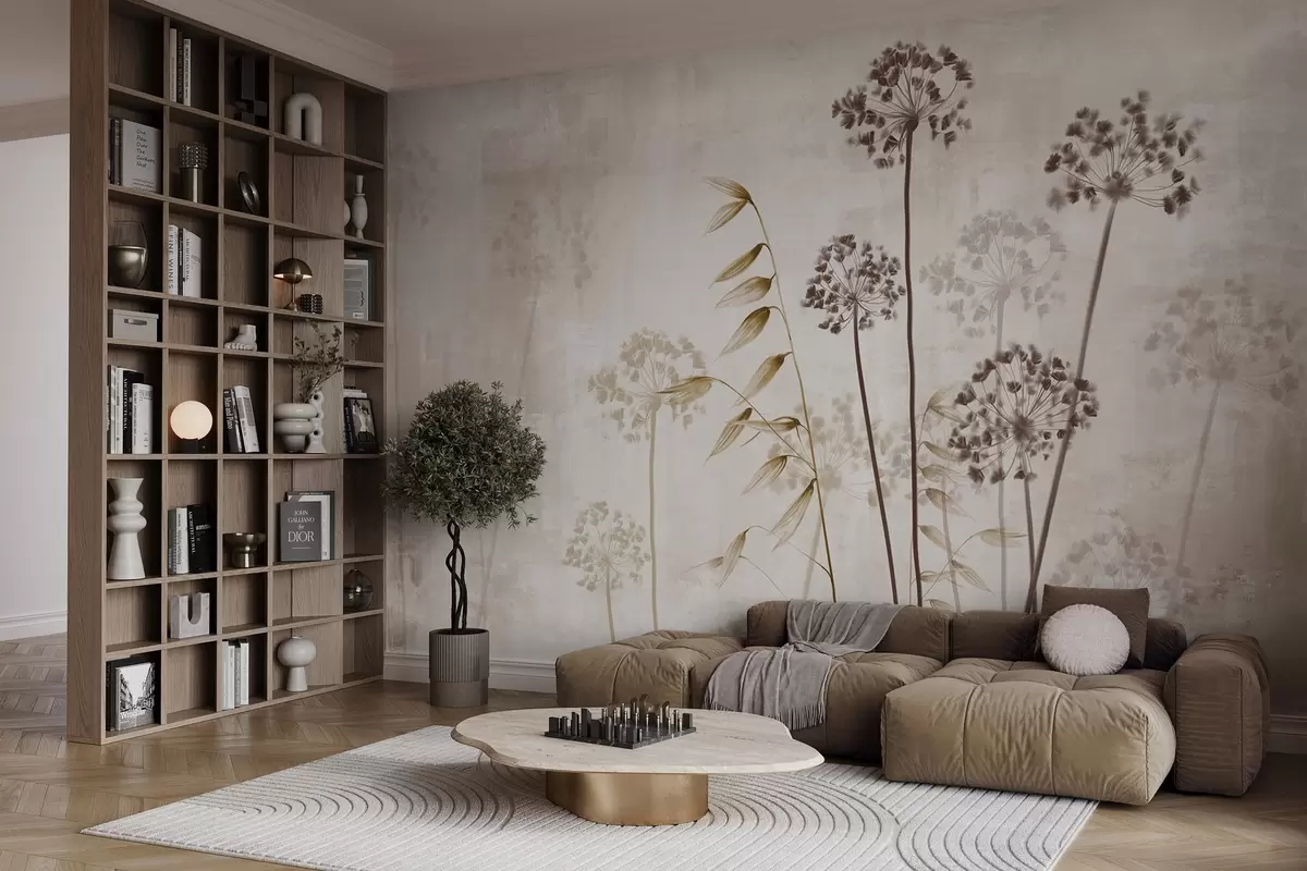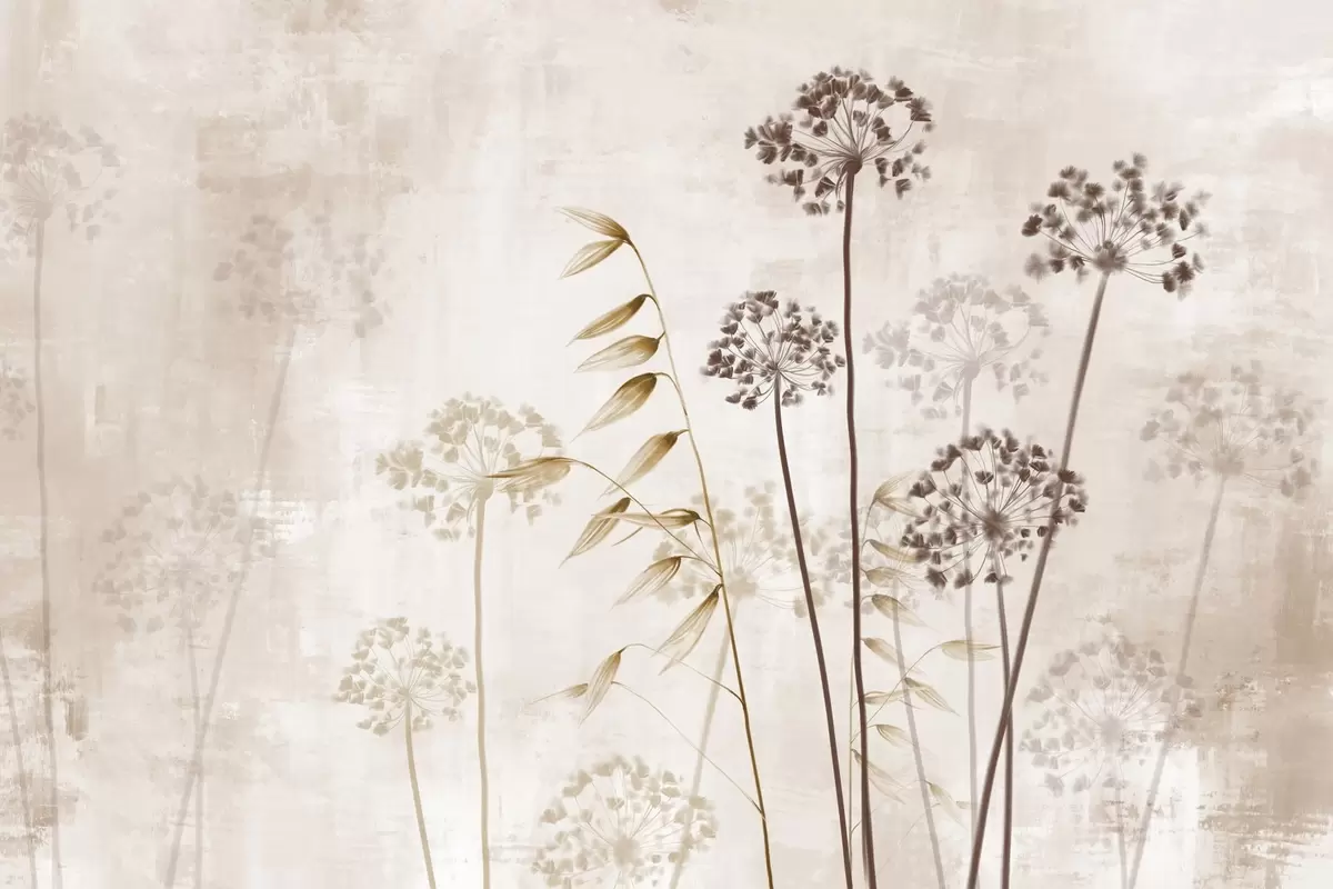 Valokuvatapetti Kuivatut kukat piirustus pitkillä varret, yksivärinen paletti, vastaan kuvioitu, vaalean beige tausta, kasvitieteellinen kuvitus Nr w09314v1