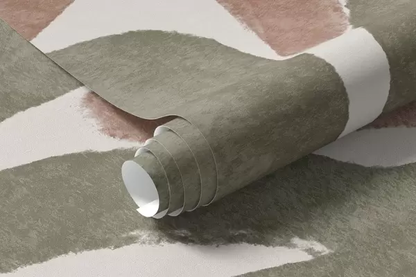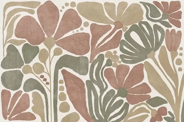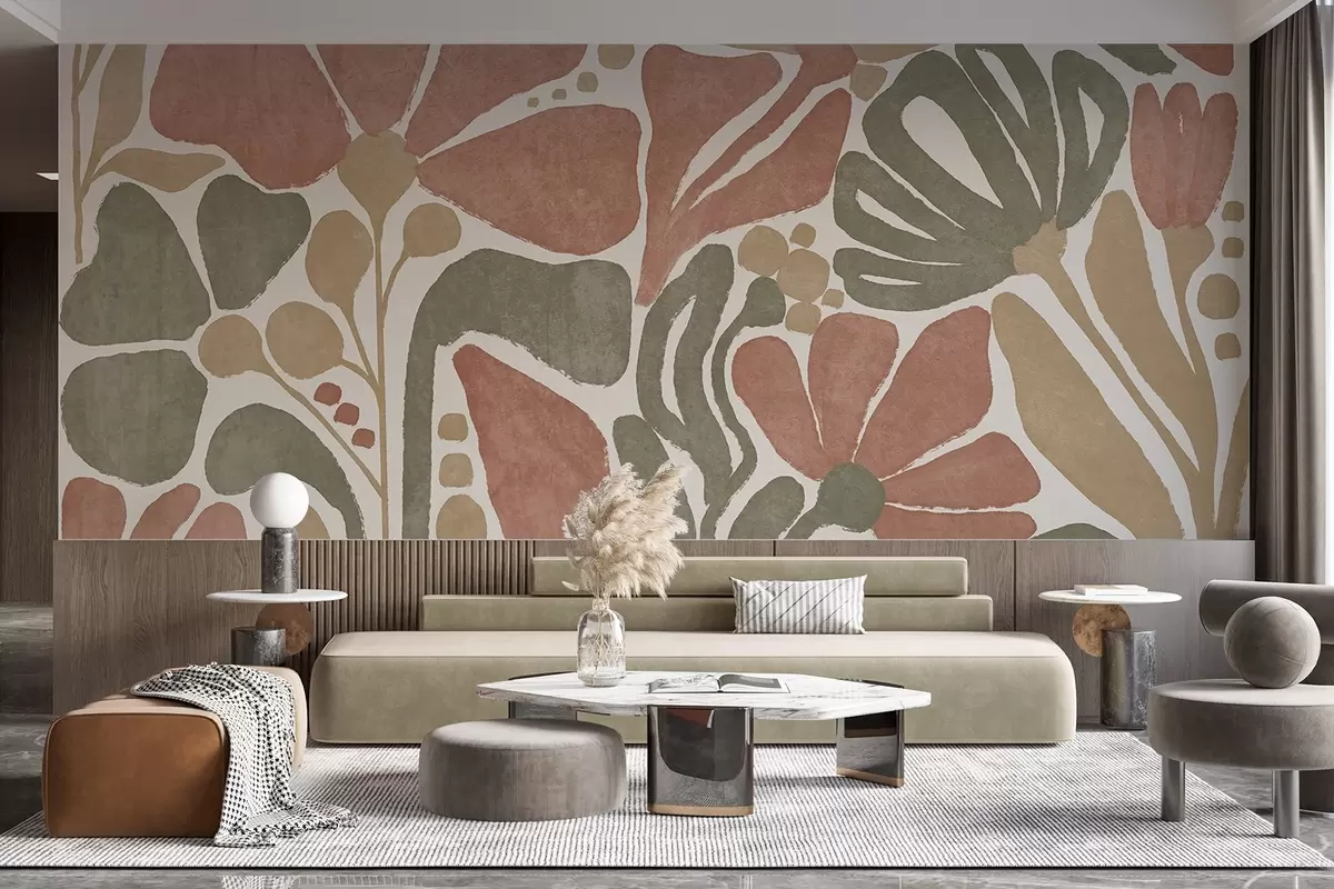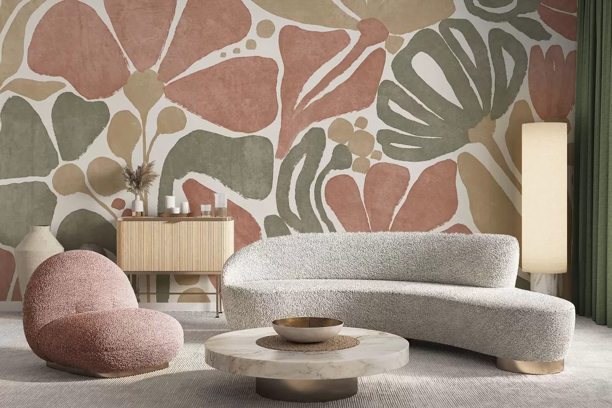 Valokuvatapetti Abstrakteja kukkia punaisen, vihreän ja beigen sävyissä, vaalealla taustalla, litteässä, tyylitellyssä modernissa minimalistisessa muotoilussa Nr w09315