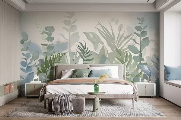 Valokuvatapetti Pastellivihreät kasvit saniaiset, monstera ja eukalyptus, kevyt kuvioitu tausta, pehmeä valaistus, rauhallinen , kasvitieteellinen kuvitus Nr w09316
