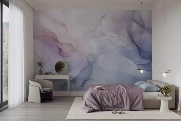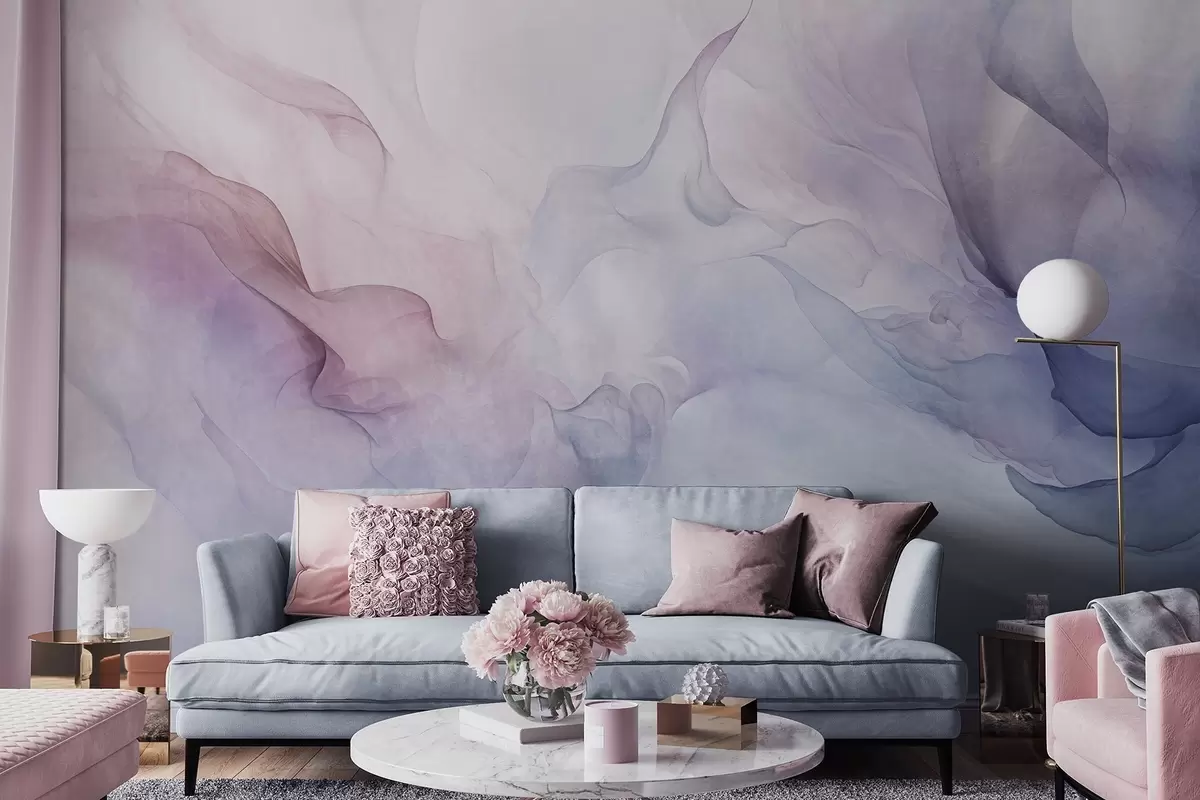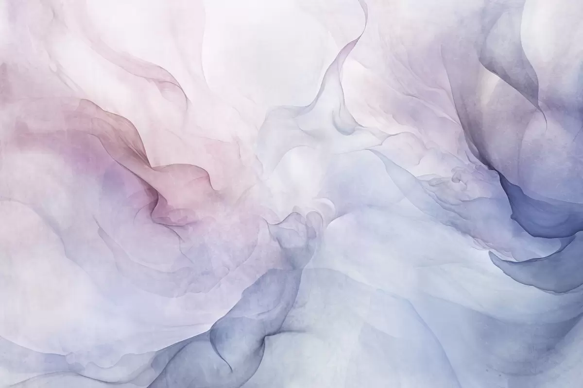 Valokuvatapetti Abstrakti kuvioitu maalaus, jossa virtaa vaaleanpunaisen, violetin ja sinisen pastellisävyjä, jotka luovat pehmeän vaikutelman Nr w09318