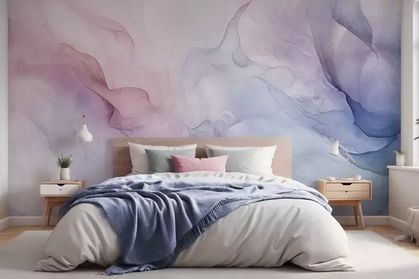 Valokuvatapetti Abstrakti kuvioitu maalaus, jossa virtaa vaaleanpunaisen, violetin ja sinisen pastellisävyjä, jotka luovat pehmeän vaikutelman Nr w09318