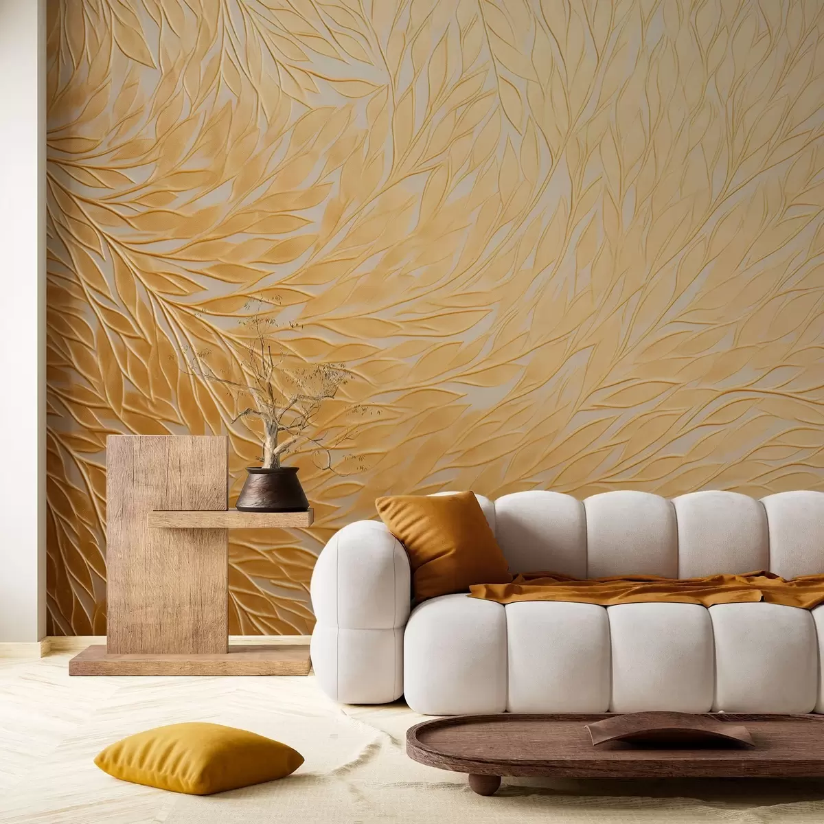 Valokuvatapetti Kohokuvioitu lehtikuvio lämpimissä hunajankeltaisissa sävyissä Nr w09325