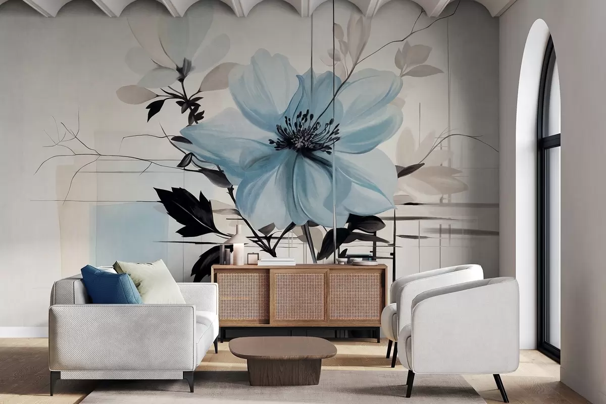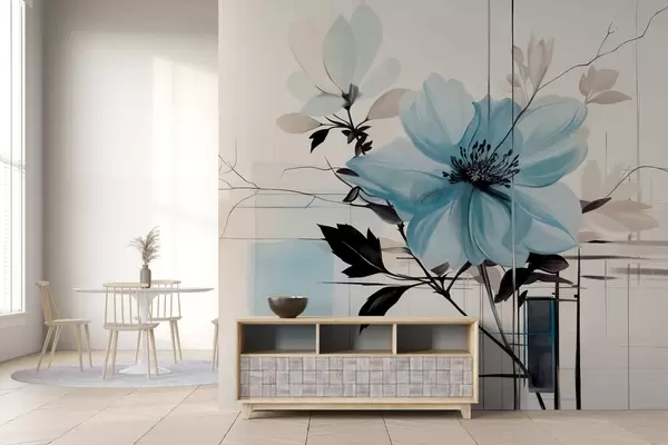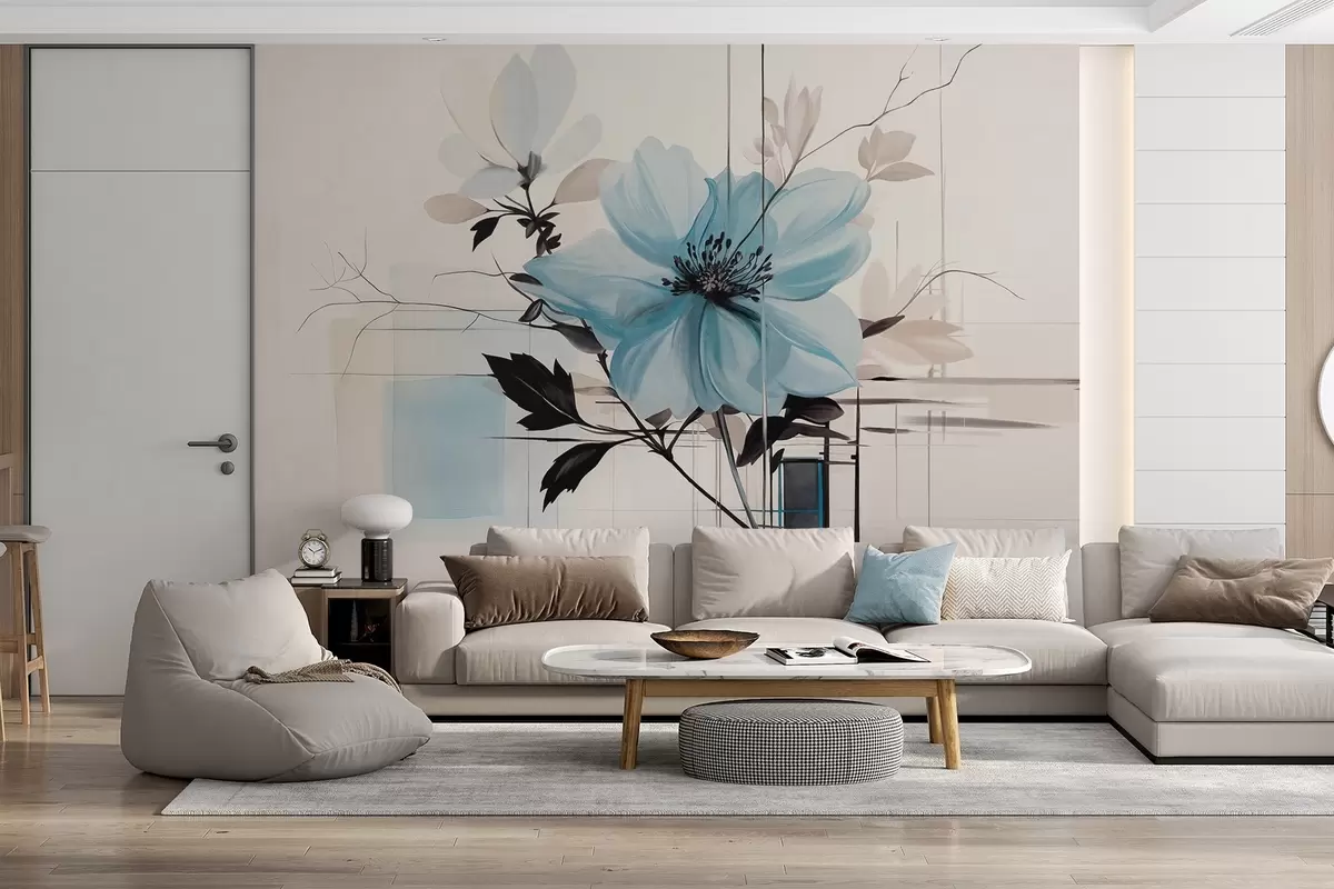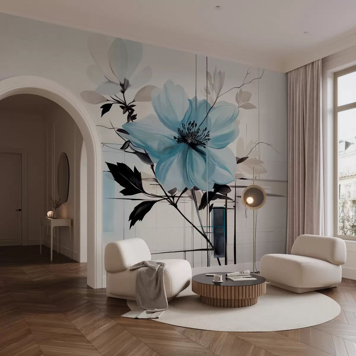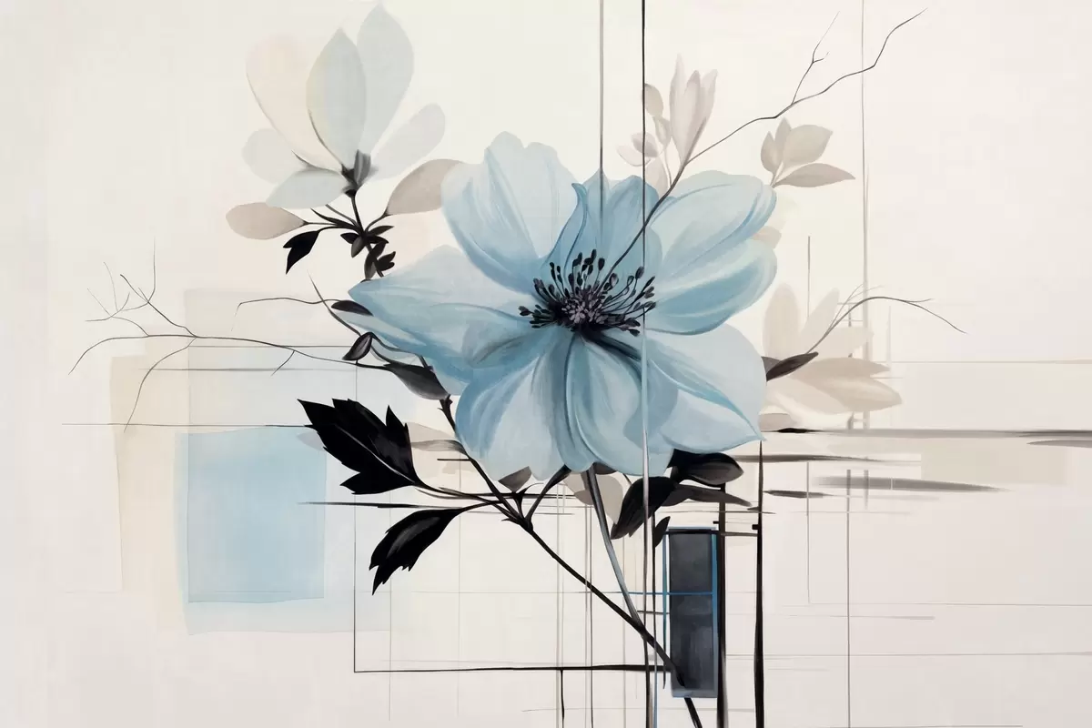 Valokuvatapetti Abstrakti kuvioitu sininen kukka, jossa on tummat lehdet ja oksat, geometriset minimalistiset muodot ja viivat hillityillä väreillä Nr w09332