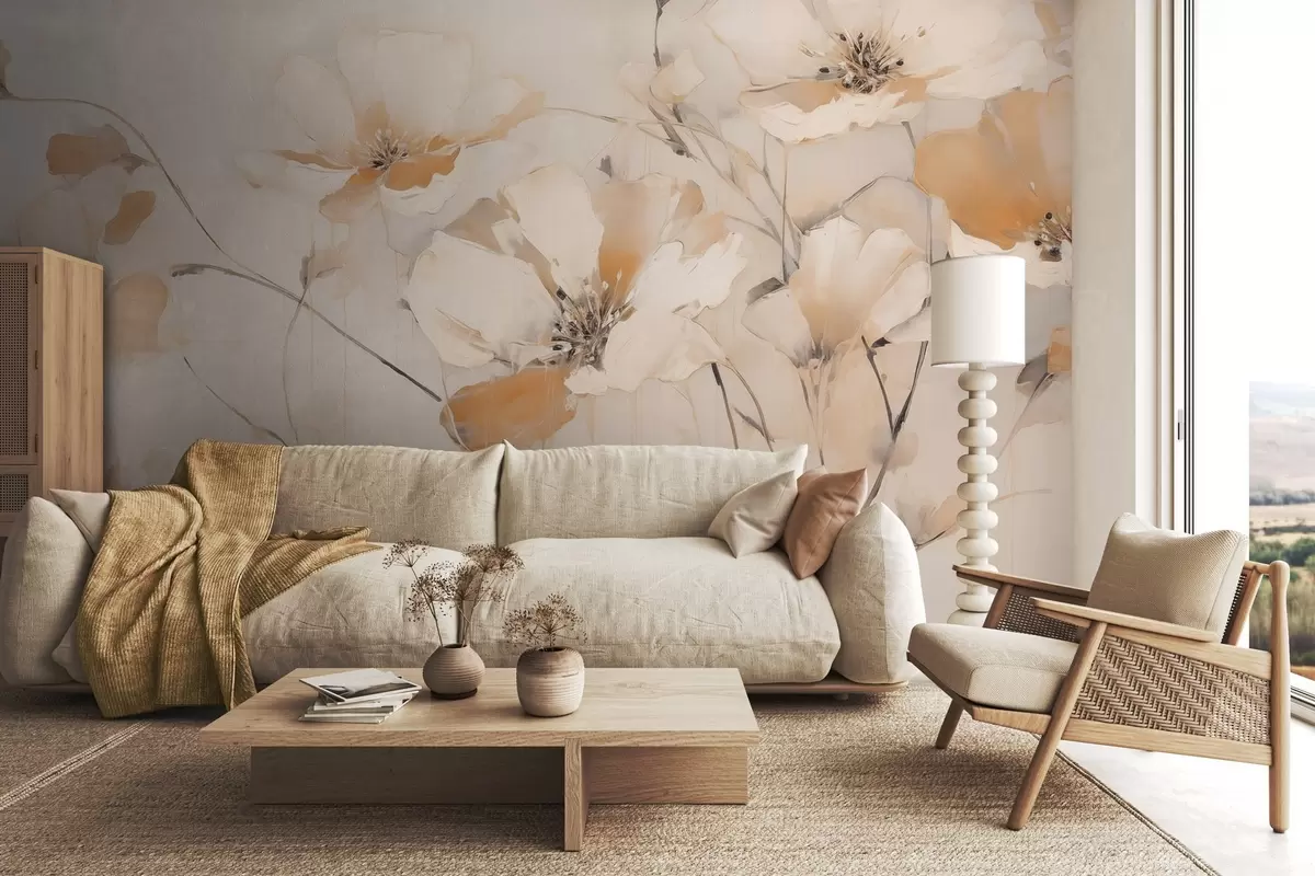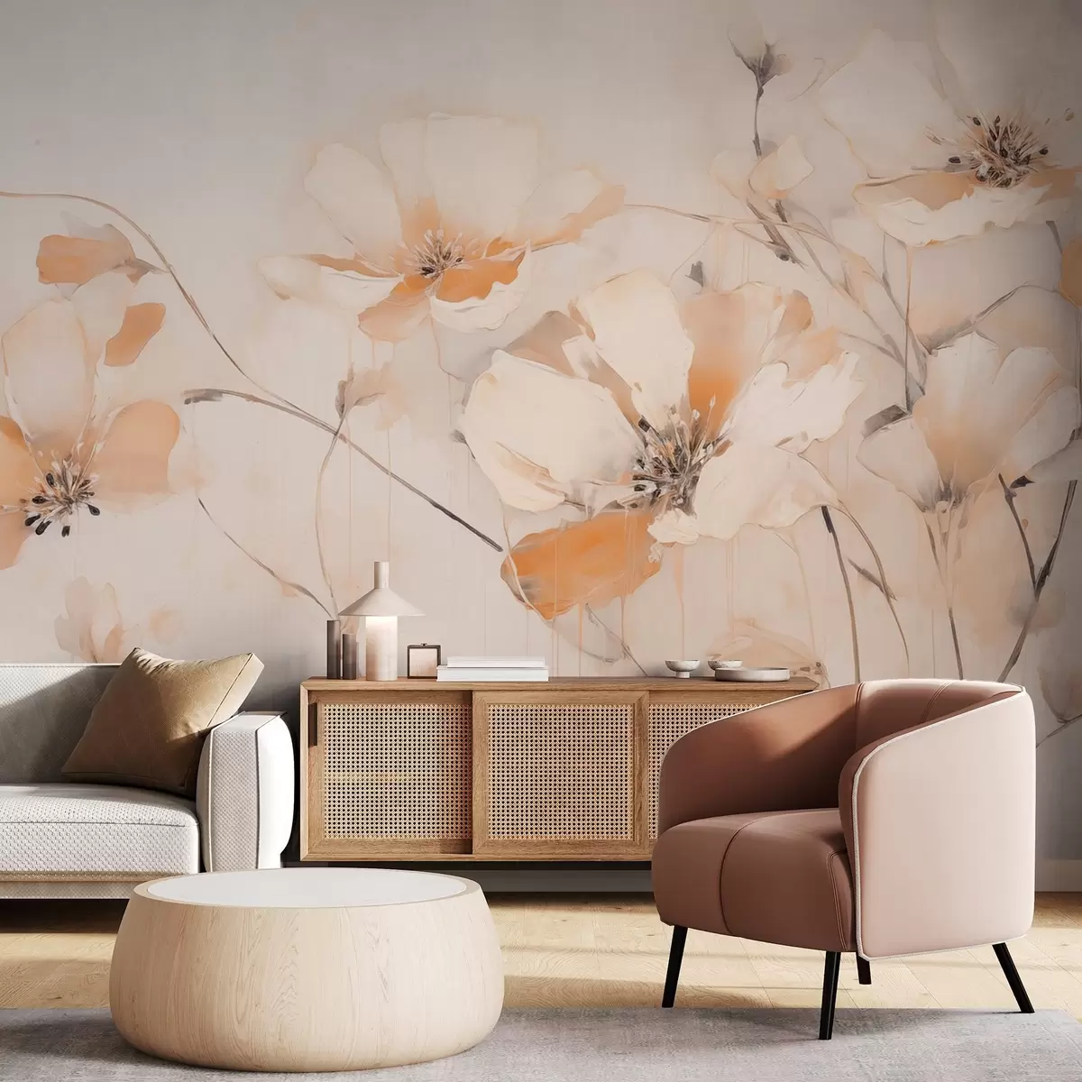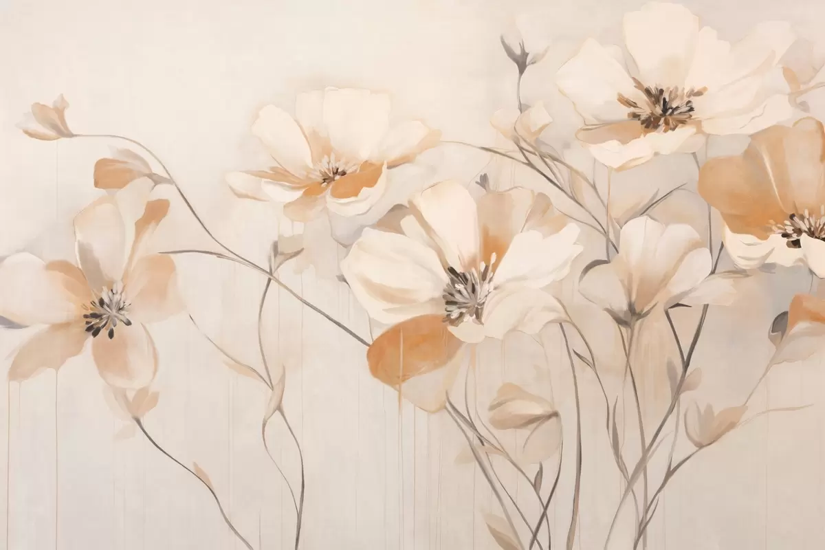 Valokuvatapetti Valkoiset ja oranssit kuvioidut kukat pitkillä varsilla, vaalea tausta, pehmeät värit, elegantti sommittelu, herkät siveltimenvedot Nr w09335