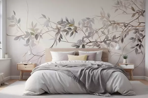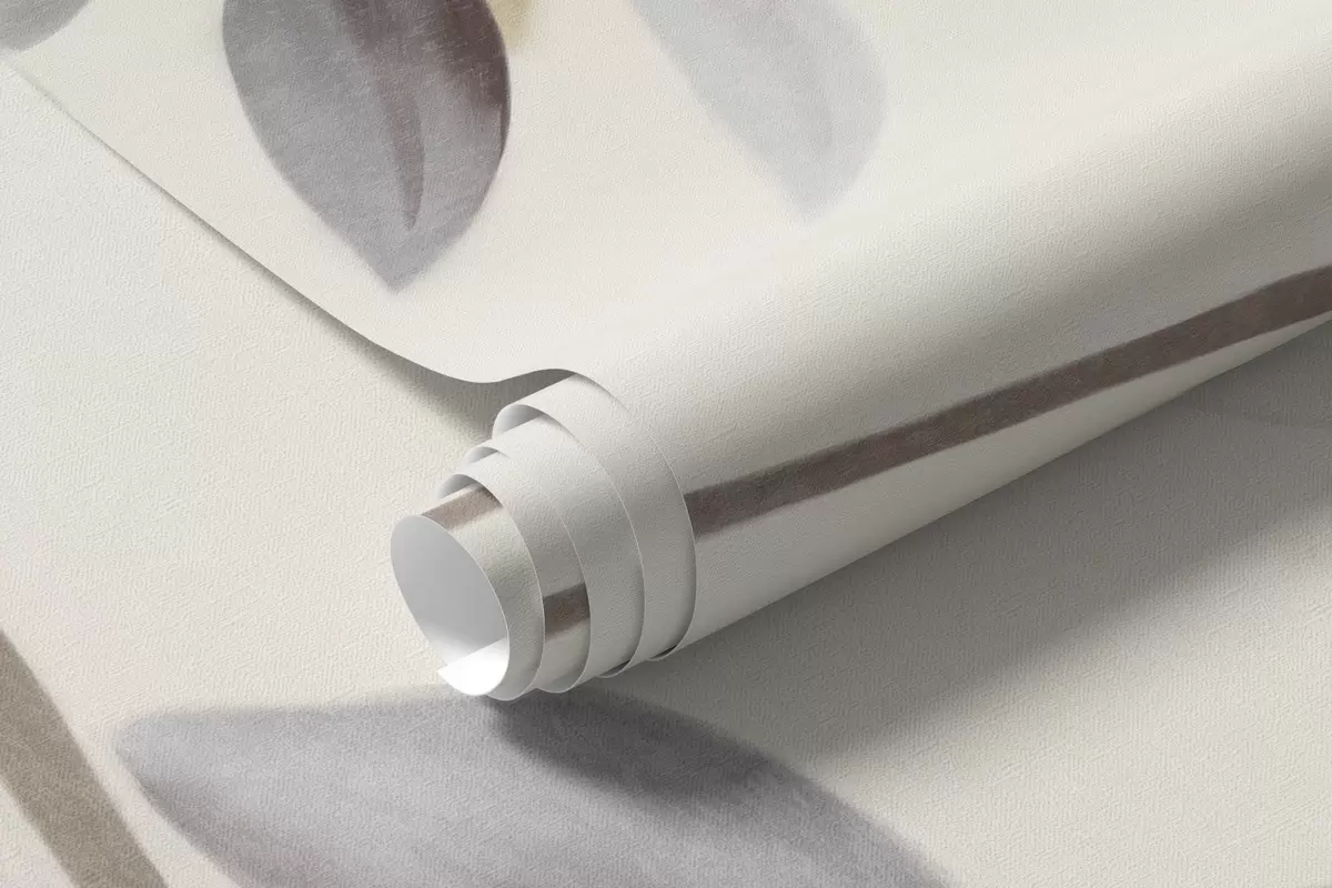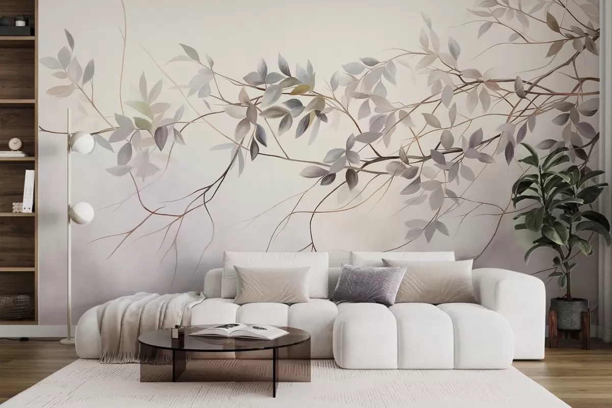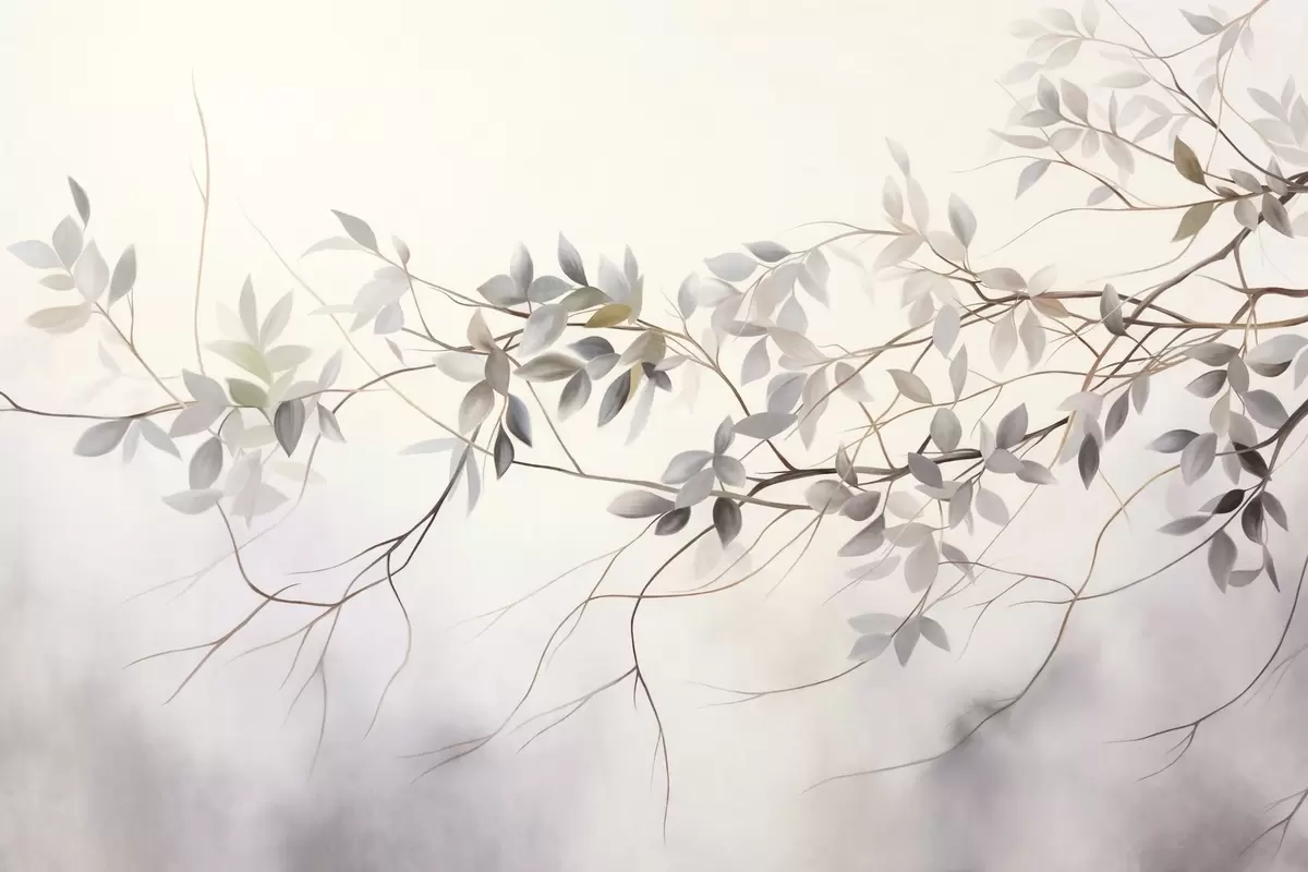 Valokuvatapetti Hienostuneesti kuvioidut oksat, joissa on hillittyjä harmaita, violetteja ja vihreitä lehtiä pehmeää, hämärtynyttä taustaa vasten. Nr w09336
