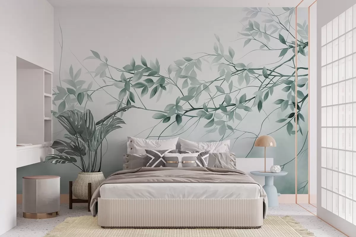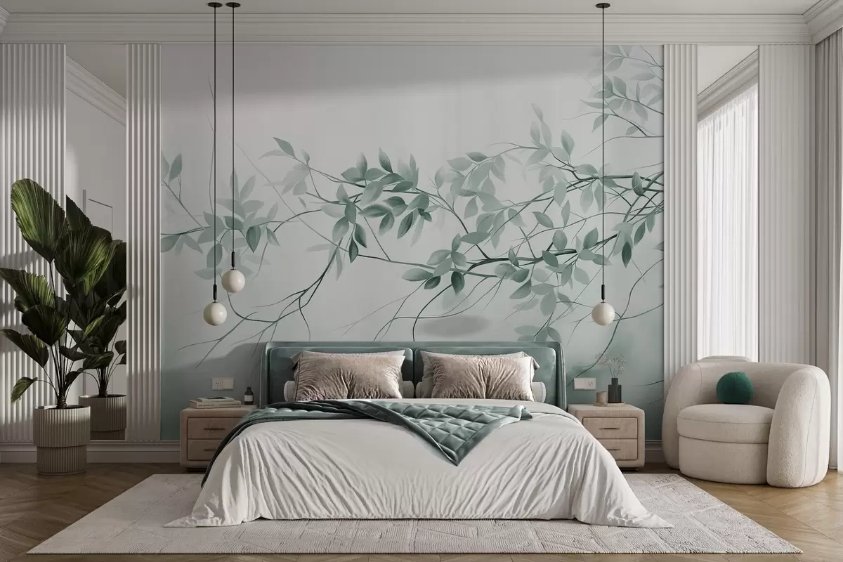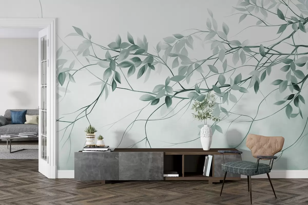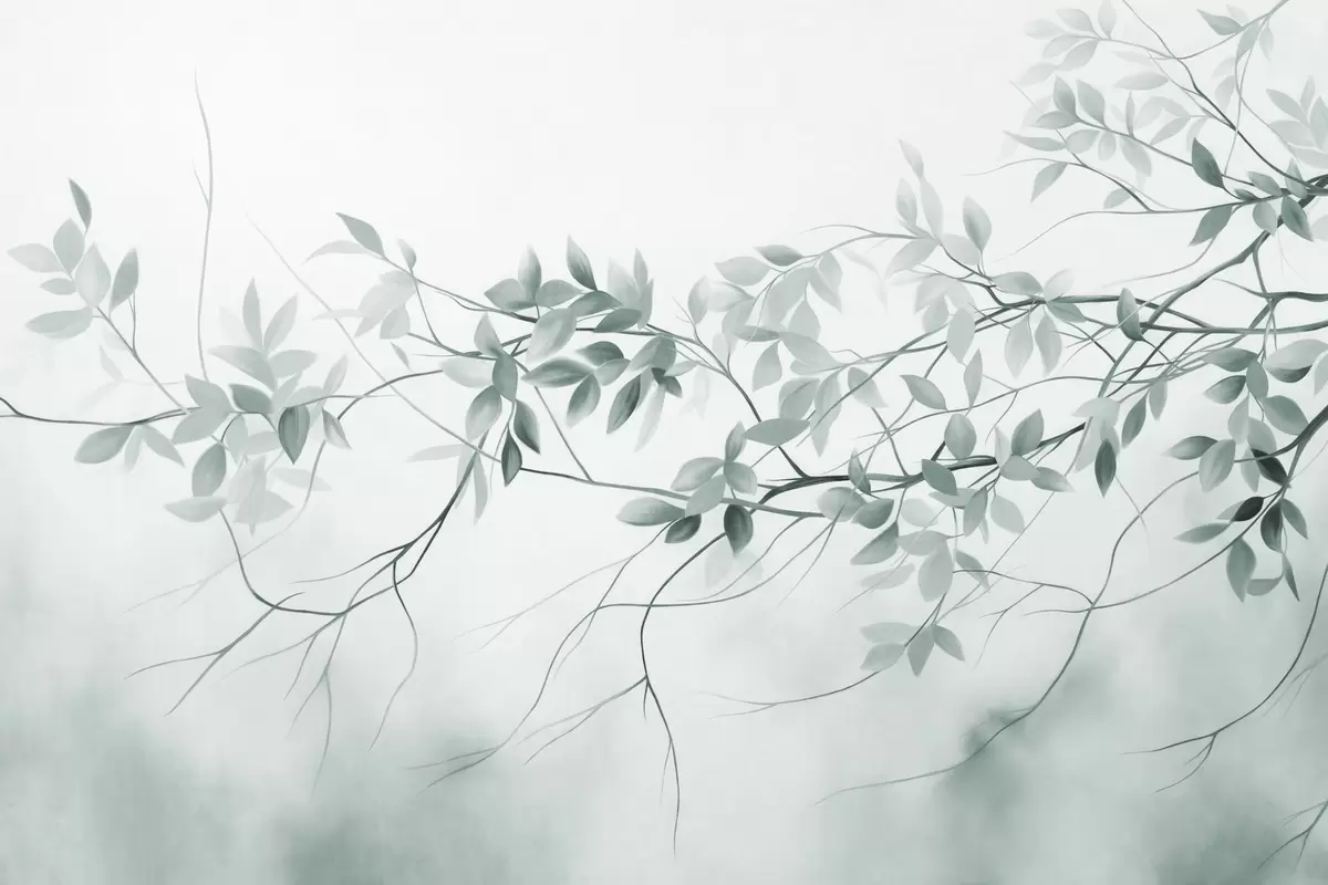 Valokuvatapetti Hienostuneen tekstuuriset oksat, joissa on hillityn harmaat ja vihreät lehdet pehmeää, hämärtynyttä taustaa vasten. Nr w09336v1