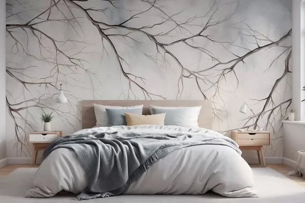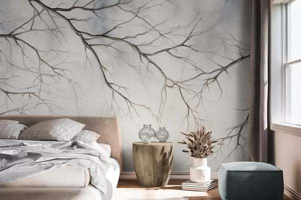 Valokuvatapetti Puun oksat, joissa on vesivärin kuvioitu vaikutus , monimutkaisia yksityiskohtia, pehmeä väripaletti, vaaleaa taustaa vasten Nr w09337