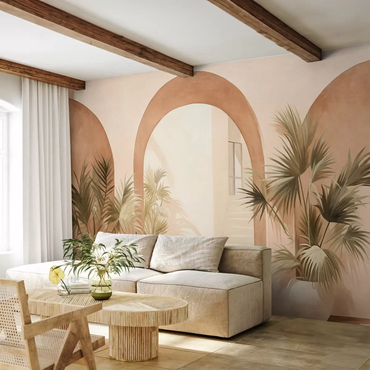 Valokuvatapetti Kuvioidut kaaret ruukkukasveilla, vaalean beige väripaletti, minimalistinen muotoilu, taustalla portaikko Nr w09339