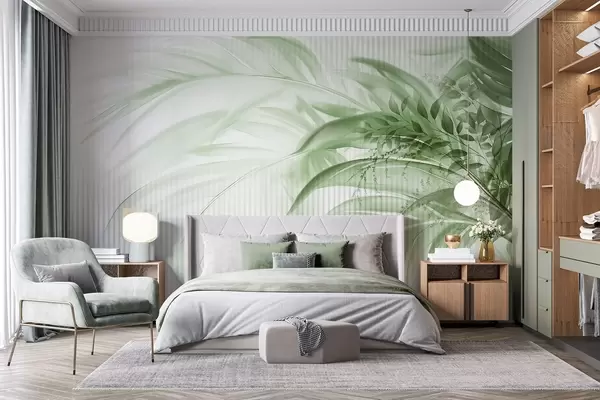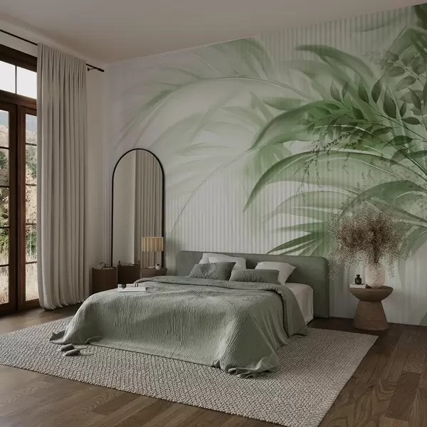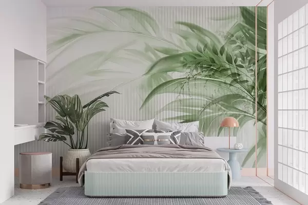 Valokuvatapetti Palmun trooppisen vihreät lehdet valkoisella raidallisella taustalla, pehmeä valaistus, herkät siveltimenvedot, orgaaniset muodot Nr w09343