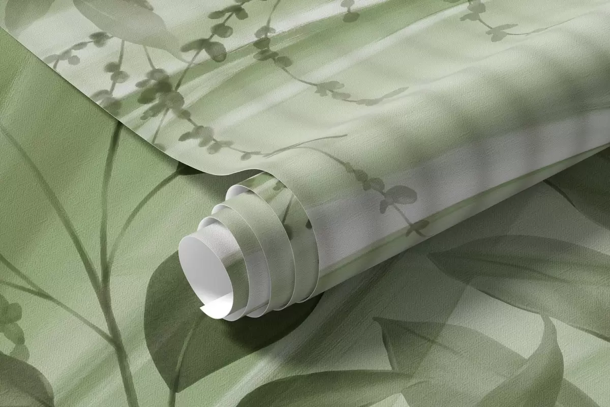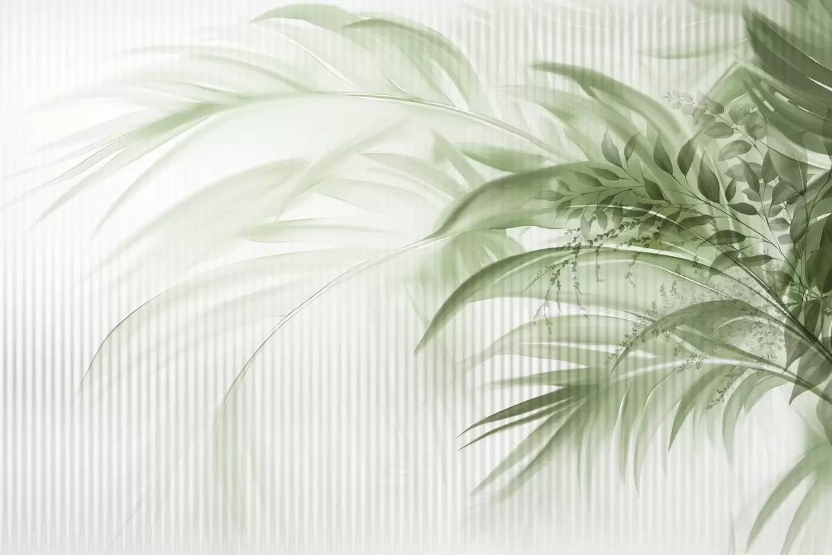 Valokuvatapetti Palmun trooppisen vihreät lehdet valkoisella raidallisella taustalla, pehmeä valaistus, herkät siveltimenvedot, orgaaniset muodot Nr w09343