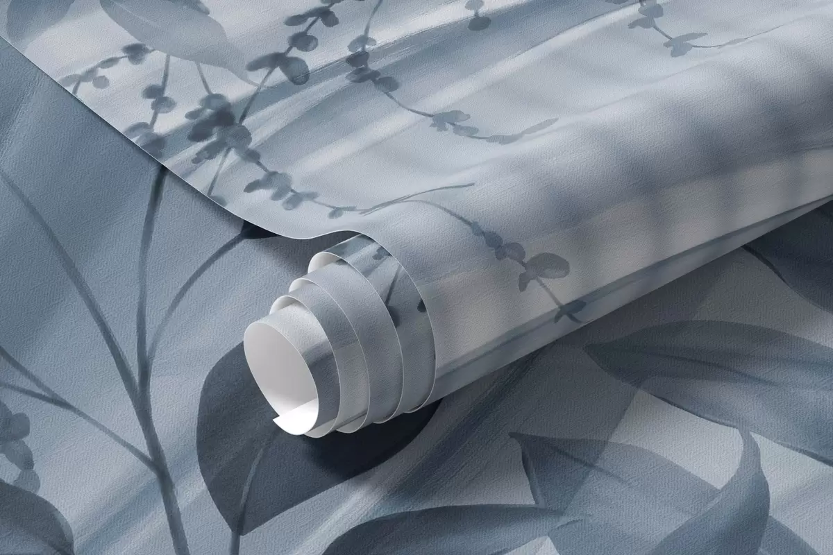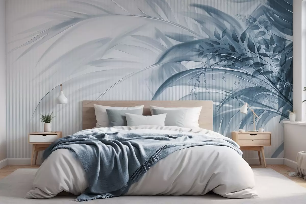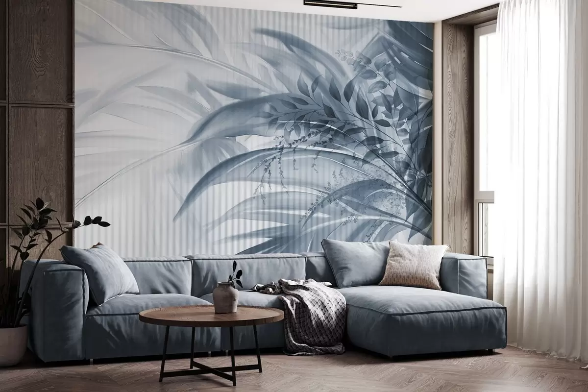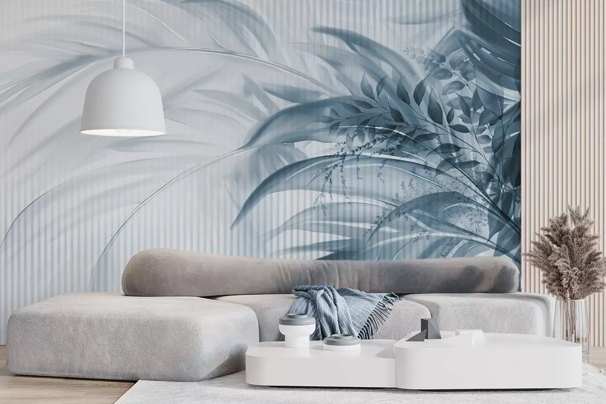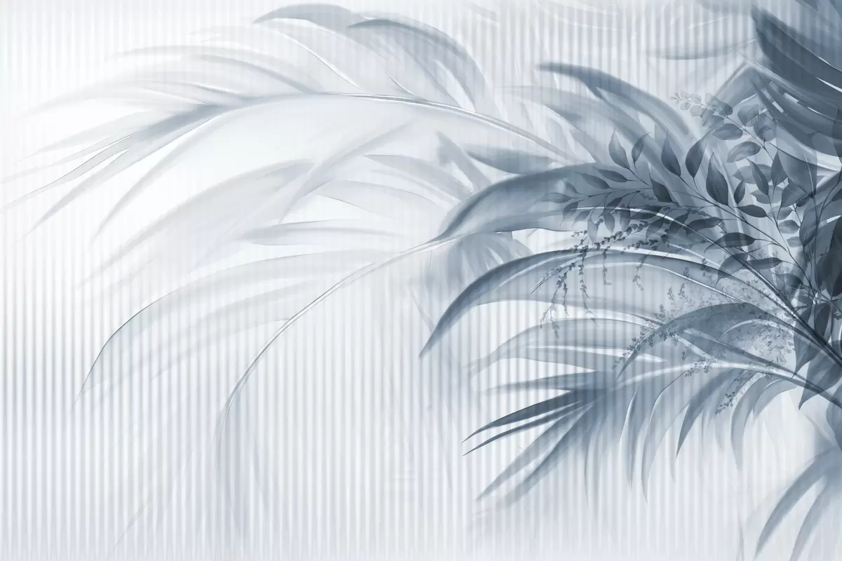 Valokuvatapetti Palmun trooppiset siniset lehdet valkoisella raidallisella taustalla, pehmeä valaistus, herkät siveltimenvedot, orgaaniset muodot Nr w09343v1