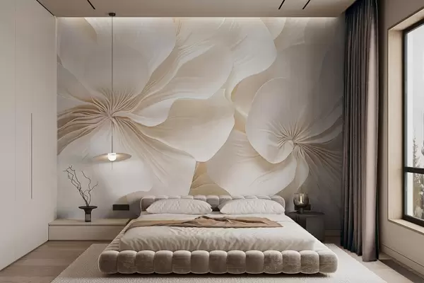 Valokuvatapetti Lähikuva kermaisen kuvioitu kukkia, joissa on herkkiä, virtaavia terälehtiä, luoden pehmeän, tyylikkään ja kuvioidun kukka-asetelman Nr w09346
