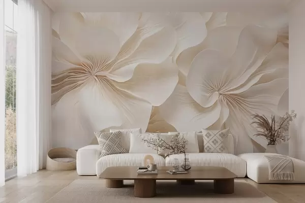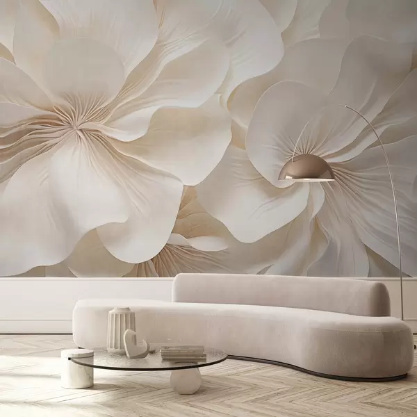 Valokuvatapetti Lähikuva kermaisen kuvioitu kukkia, joissa on herkkiä, virtaavia terälehtiä, luoden pehmeän, tyylikkään ja kuvioidun kukka-asetelman Nr w09346