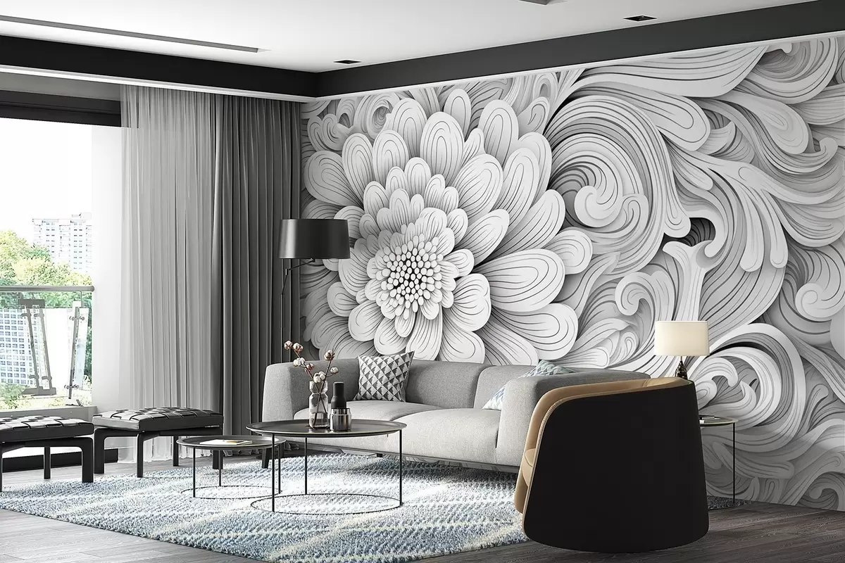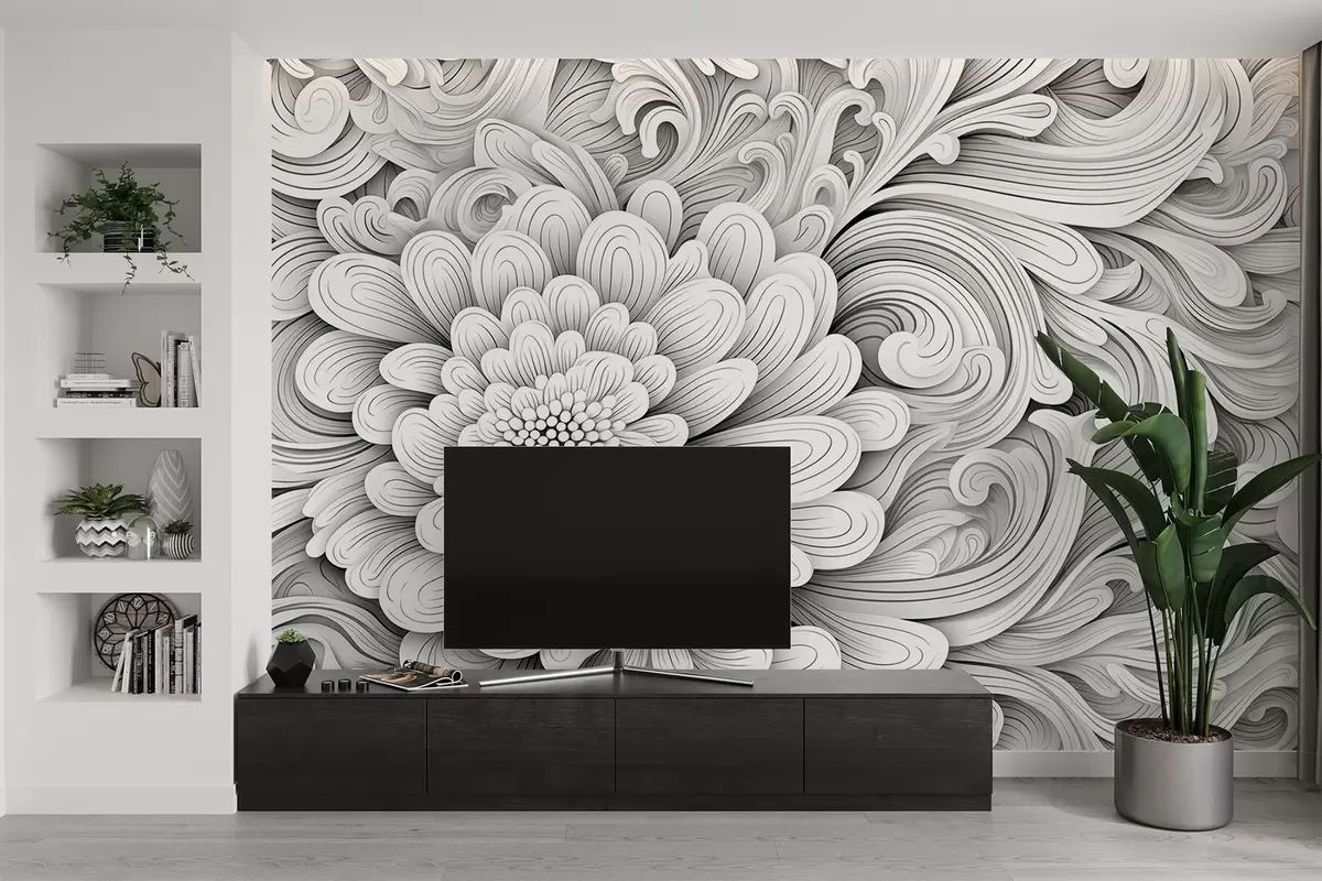 Valokuvatapetti Koristeellinen mustavalkoinen kuvio kukan ja pyörteiden muodossa Nr w09355