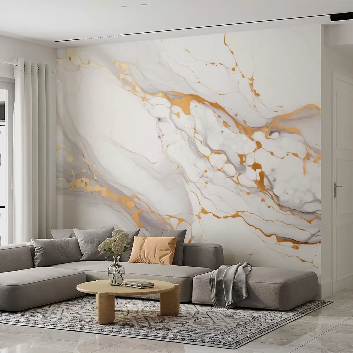 Valokuvatapetti Jäljitelmä marmoritekstiilistä, jossa on pehmeän harmaita siirtymiä ja keltaisia aksentteja Nr w09362