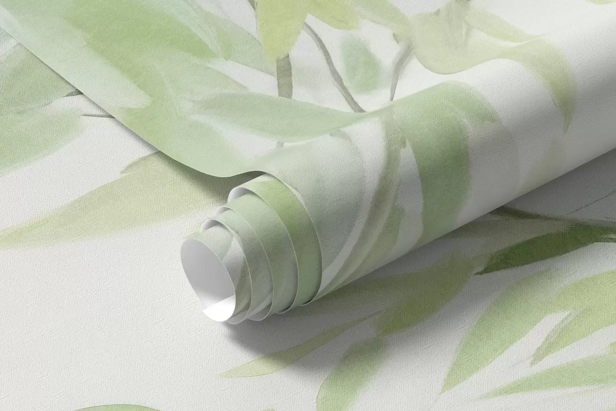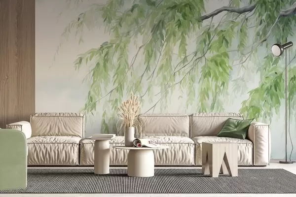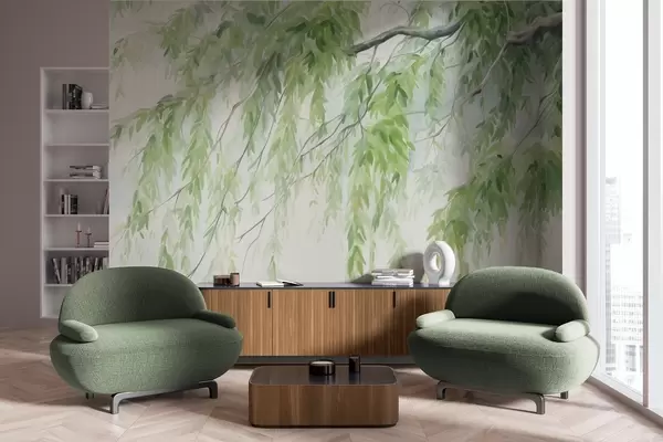 Valokuvatapetti Itkupajun oksat vihreät lehdet roikkuvat alaspäin, pehmeät ja herkät siveltimenvedot, akvarellimaalaus tyyliä Nr w09365