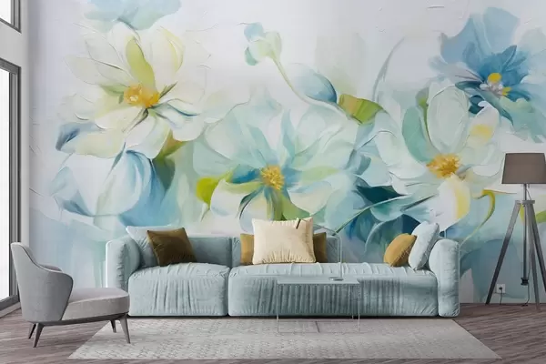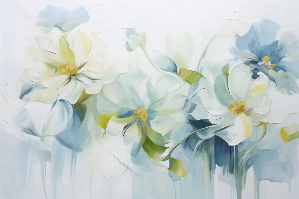 Valokuvatapetti Abstrakteja valkoisia ja sinisiä kukkia keltaisilla kukilla ja vihreillä lehdillä, valkoisella taustalla, kuvioitu maalaustyyliä Nr w09372
