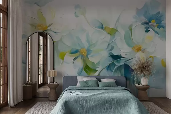 Valokuvatapetti Abstrakteja valkoisia ja sinisiä kukkia keltaisilla kukilla ja vihreillä lehdillä, valkoisella taustalla, kuvioitu maalaustyyliä Nr w09372