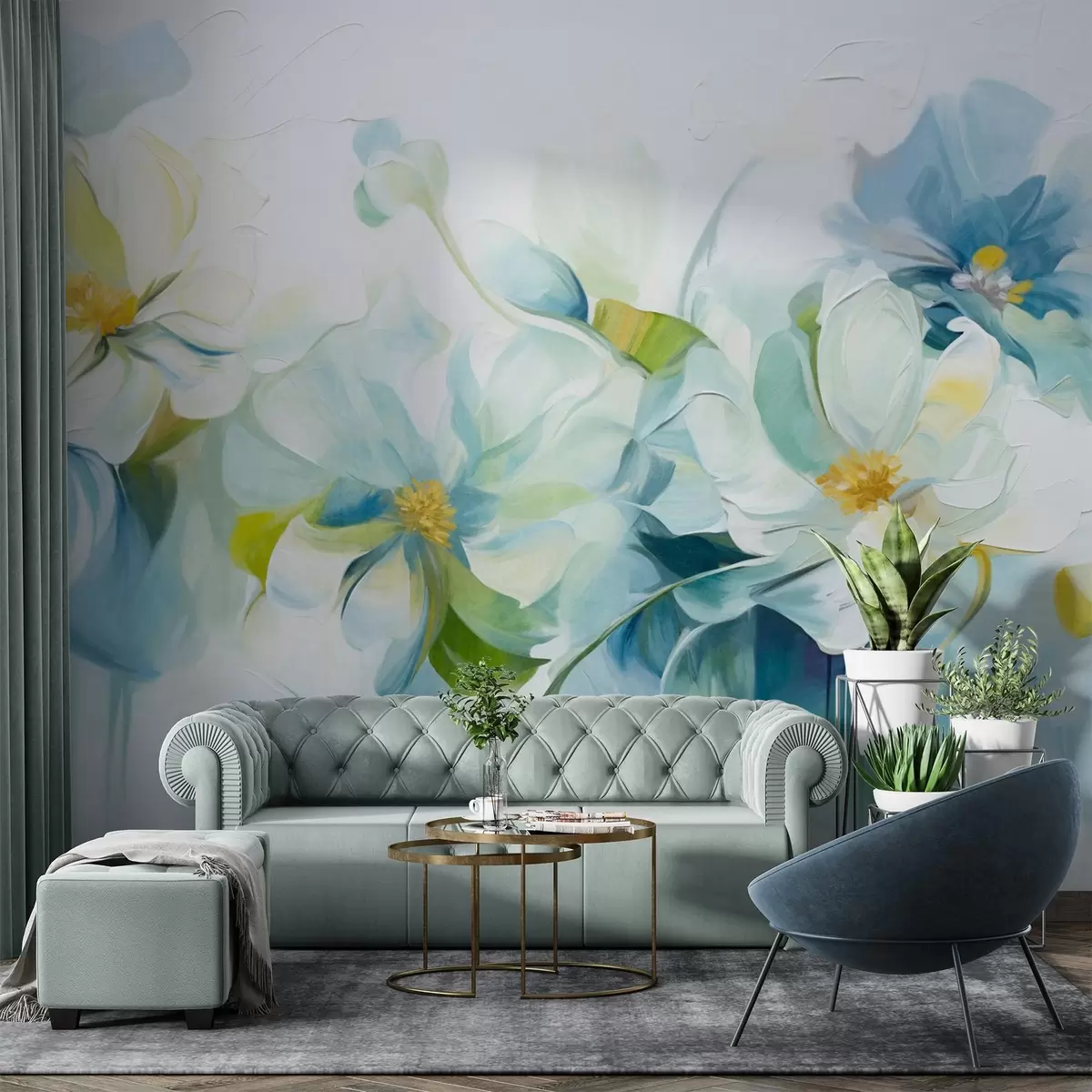 Valokuvatapetti Abstrakteja valkoisia ja sinisiä kukkia keltaisilla kukilla ja vihreillä lehdillä, valkoisella taustalla, kuvioitu maalaustyyliä Nr w09372