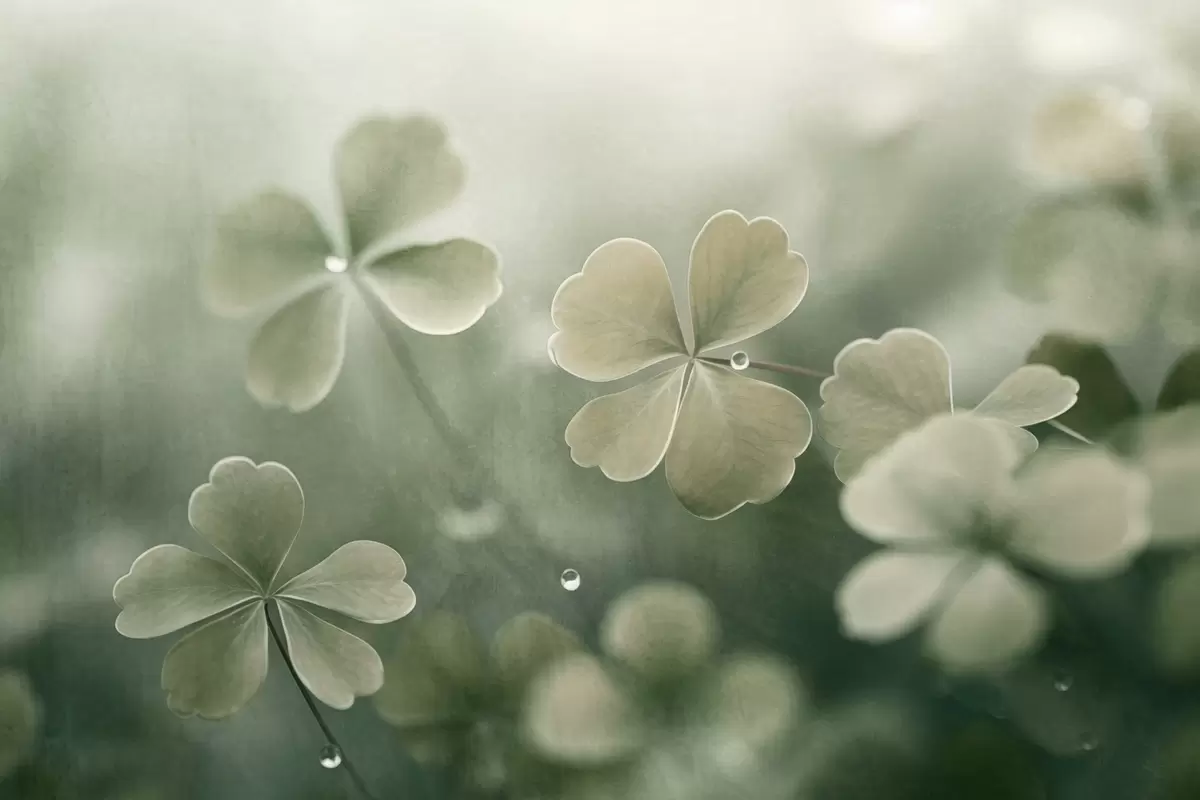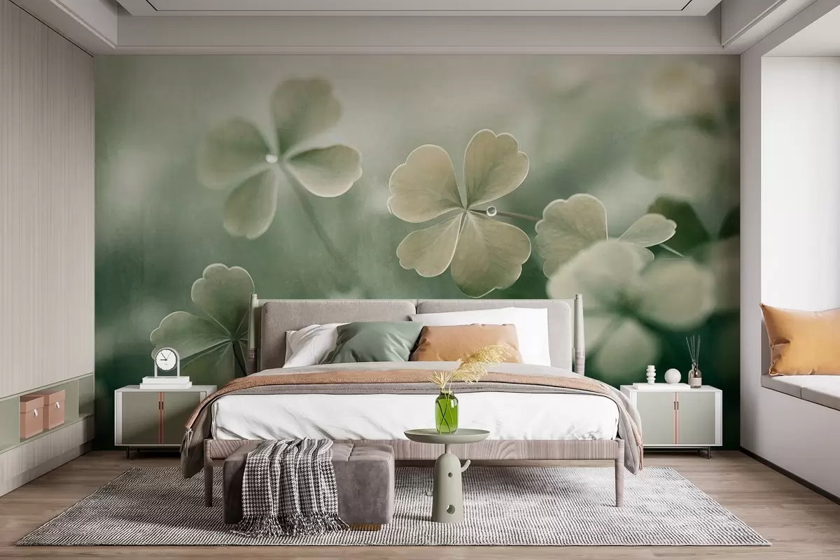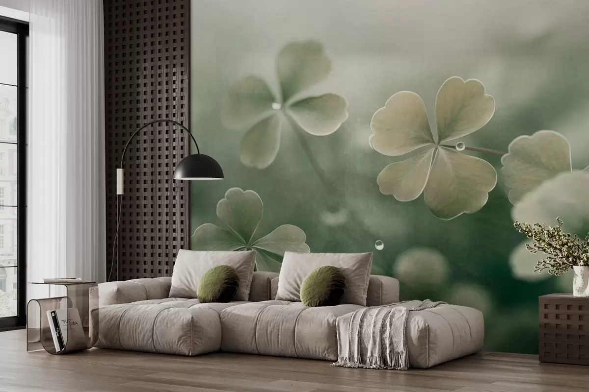 Valokuvatapetti Neljä apilaa ja vesipisaroita, vaaleanvihreä väri, pehmeä tarkennus, epätarkka tausta, kuvioitu tuloste, kuvioitu tuloste Nr w09376