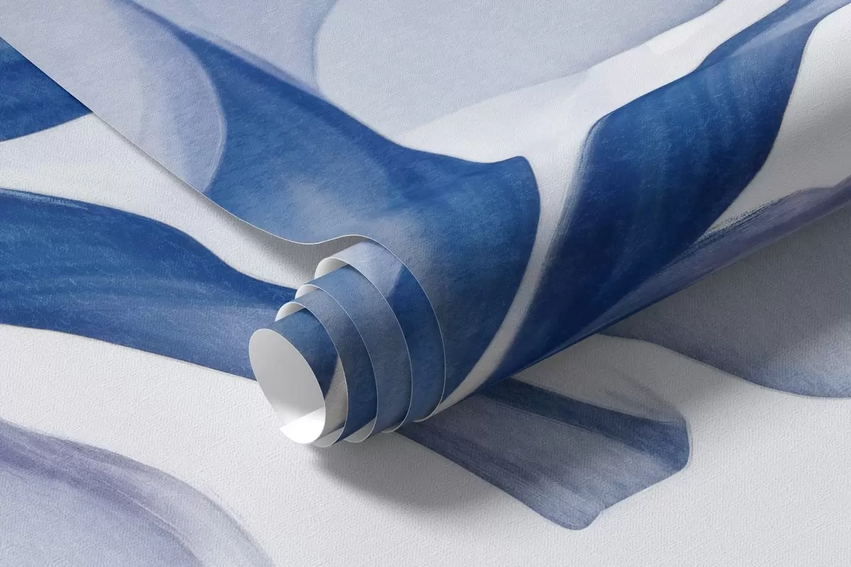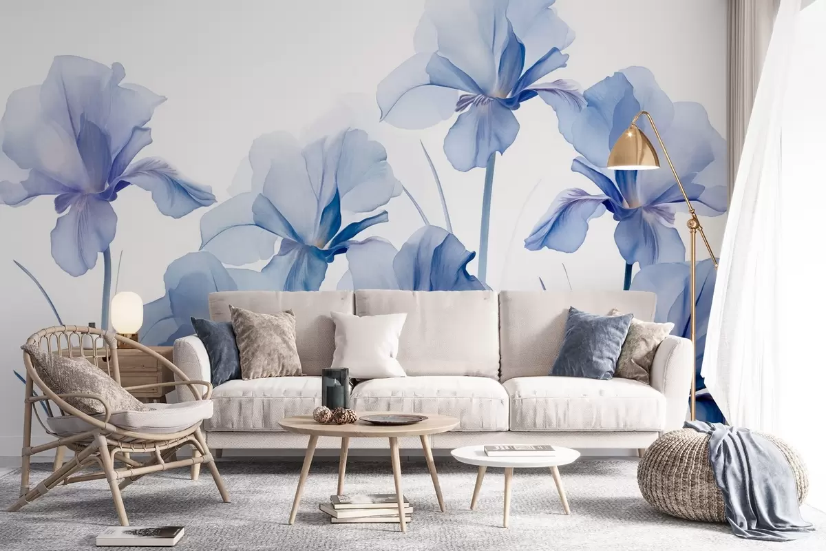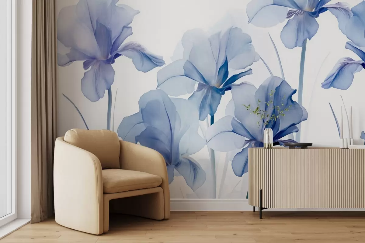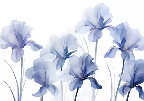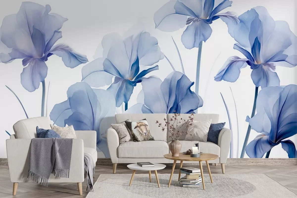 Valokuvatapetti Siniset iiriksen kukat, joissa on läpikuultavat terälehdet ja pitkät varret, järjestetty riviin sinistä taustaa vasten, pehmeä ja kuvioitu Nr w09379