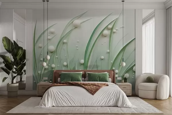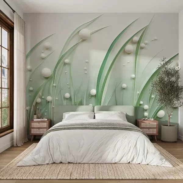 Valokuvatapetti Abstrakti vihreä ruoho valkoisilla palloilla, vaaleanvihreä tausta, kuvioitu, puhtaat linjat, minimalistinen tyyli w09382