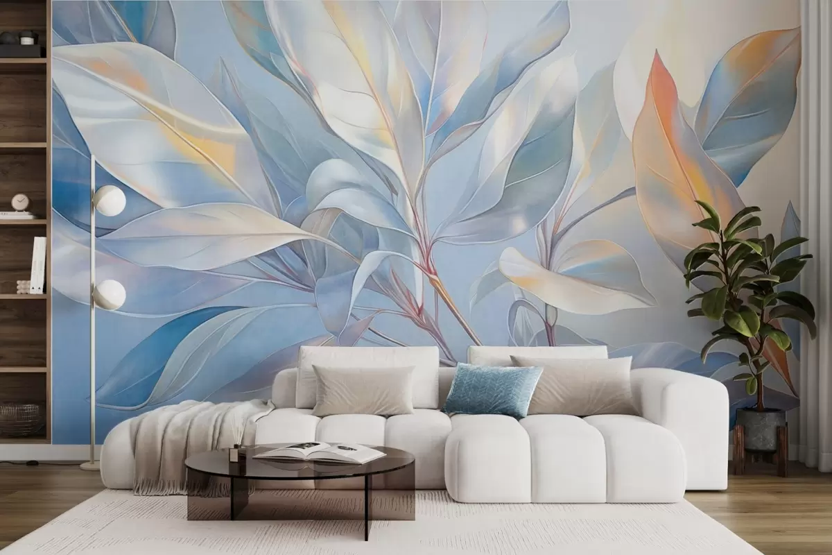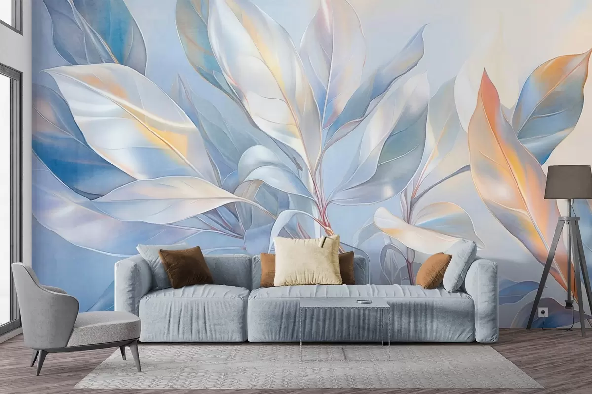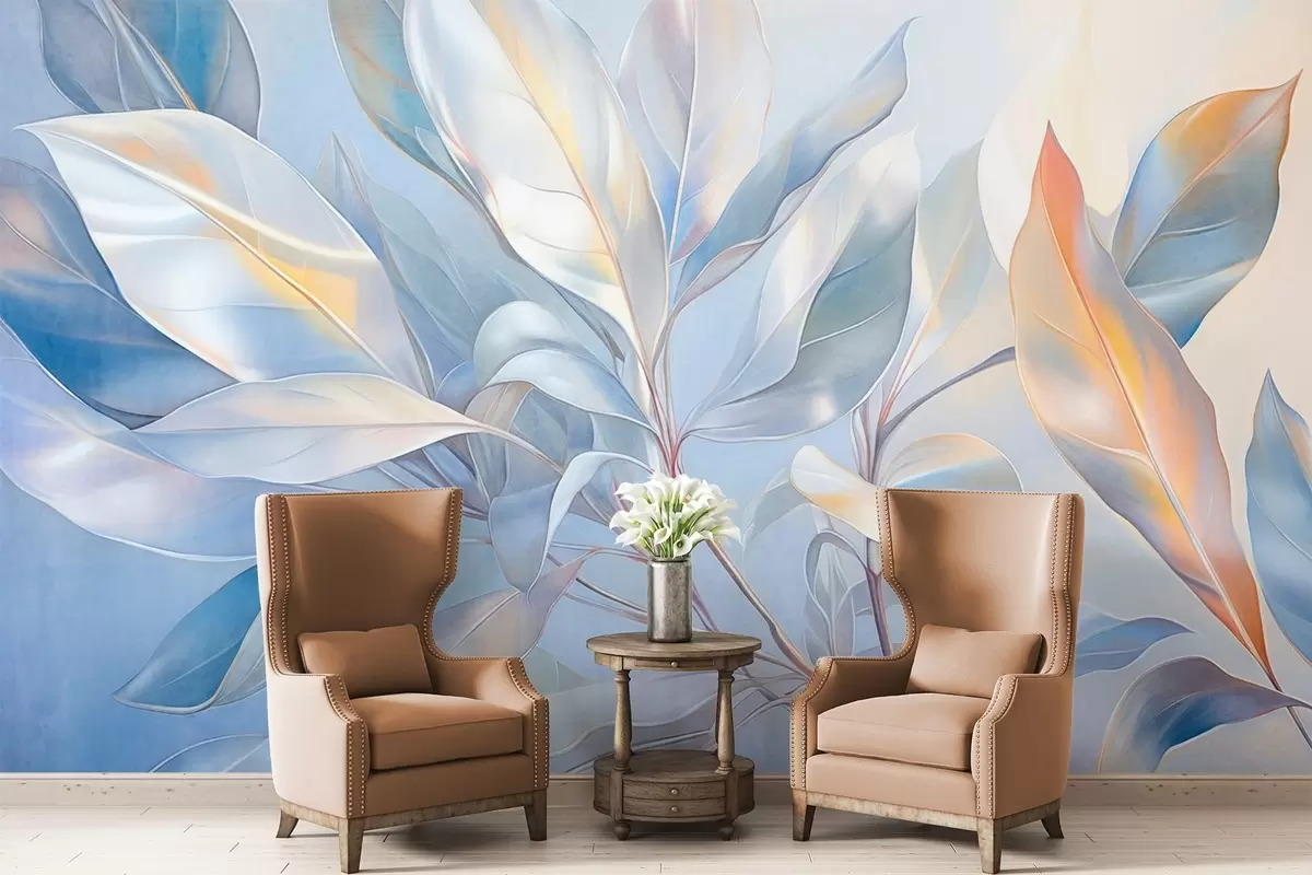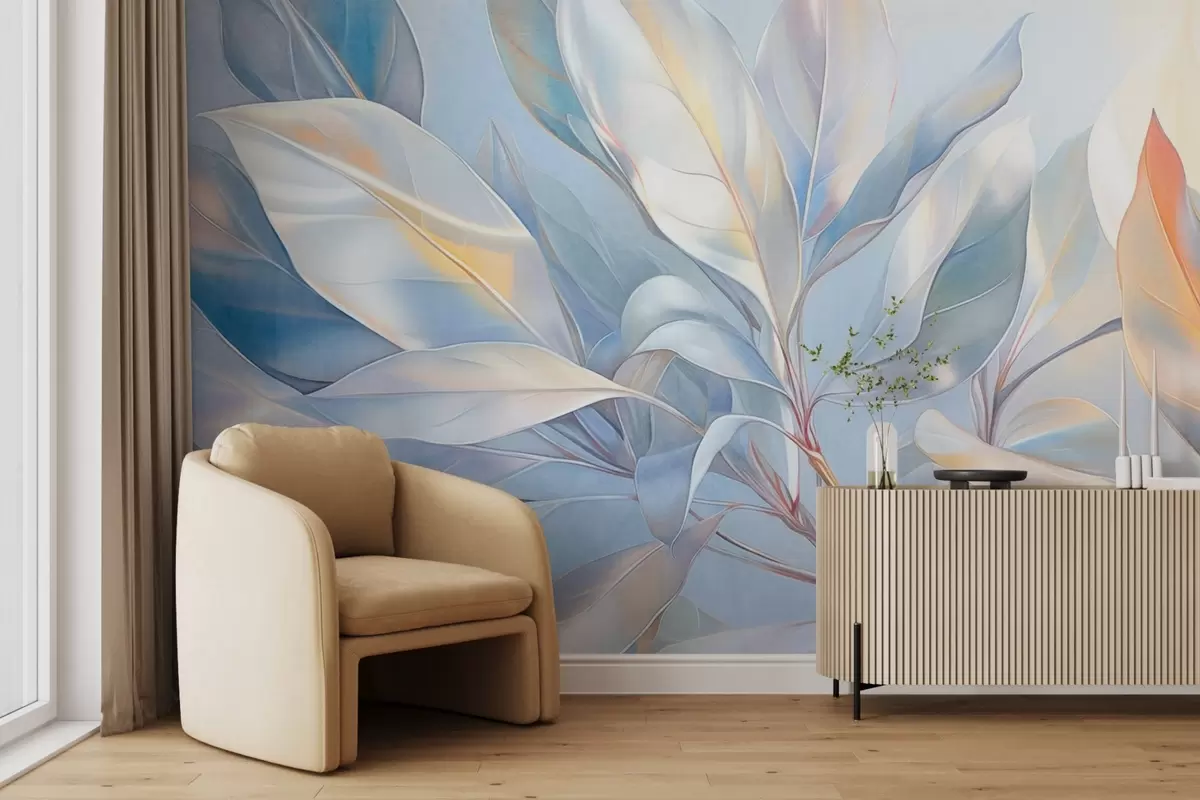 Valokuvatapetti Magnolian lehdet valkoisen ja sinisen sävyjä, pehmeä valaistus, tyylikäs sommittelu, yksityiskohtainen lehtien suonet, taiteellinen siveltimenvedot Nr w09385