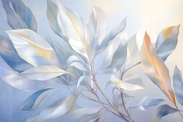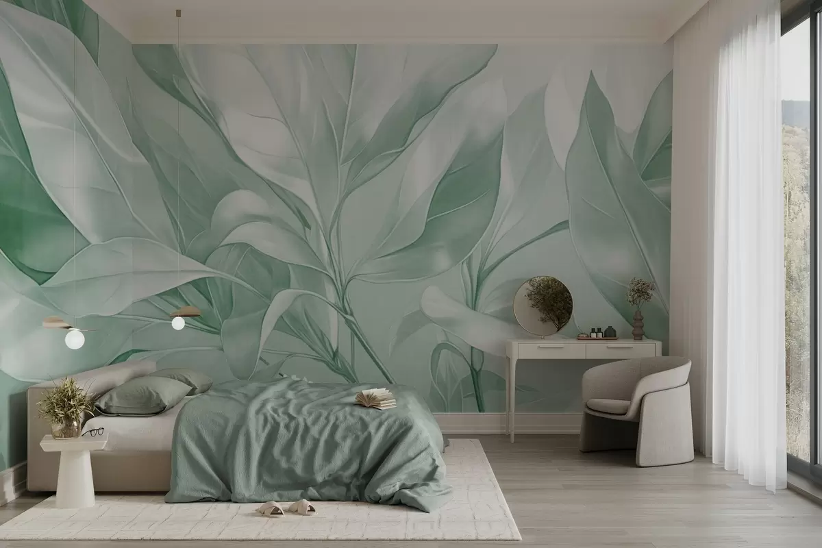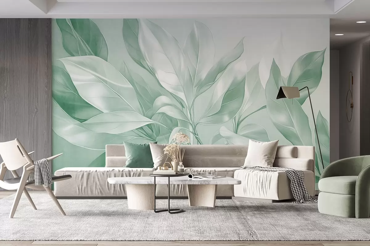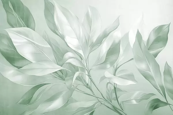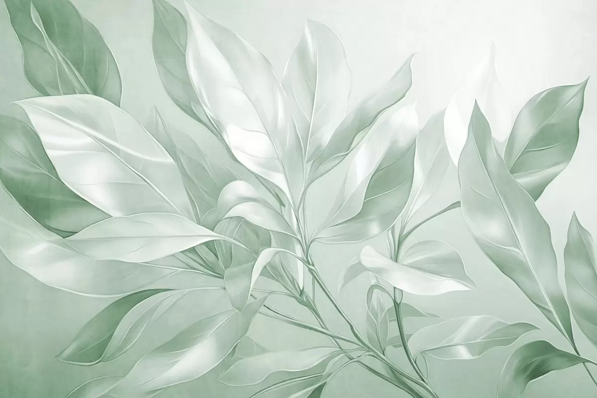Valokuvatapetti Magnolian lehdet valkoisen ja vihreän sävyillä, pehmeä valaistus, tyylikäs sommittelu, yksityiskohtaiset lehtisuonet, taiteelliset siveltimenvedot Nr w09385v1