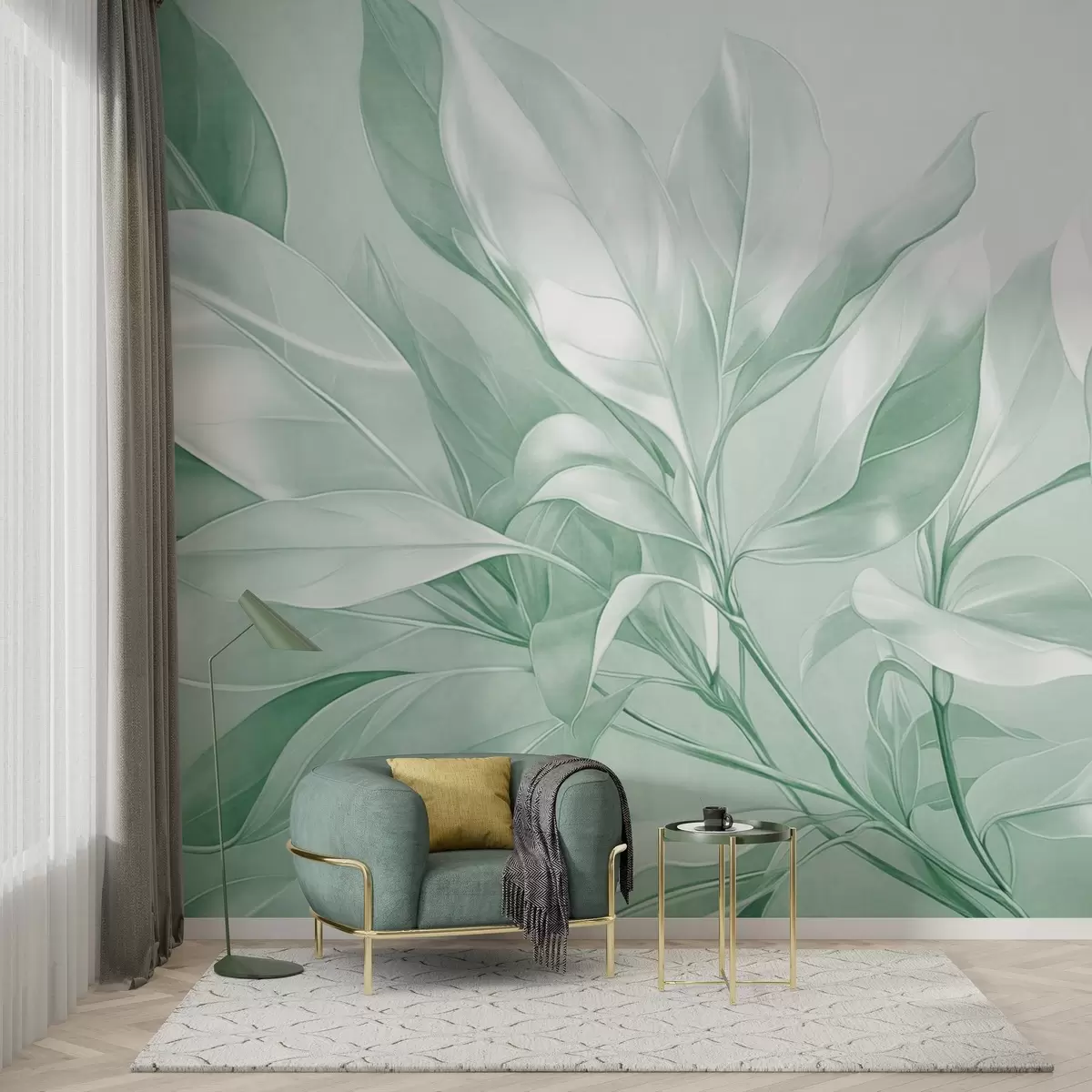 Valokuvatapetti Magnolian lehdet valkoisen ja vihreän sävyillä, pehmeä valaistus, tyylikäs sommittelu, yksityiskohtaiset lehtisuonet, taiteelliset siveltimenvedot Nr w09385v1
