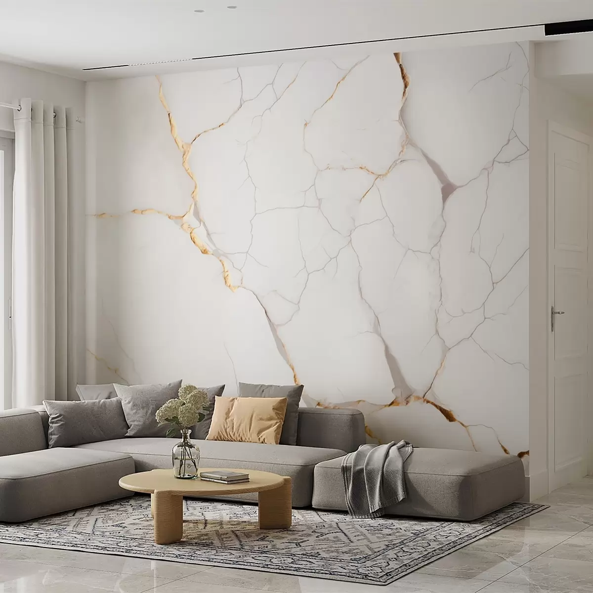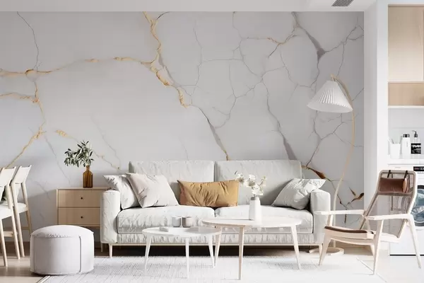 Valokuvatapetti Marmorin jäljitelmä, jossa on hienoja halkeamia ja keltaisia suonia Nr w09390