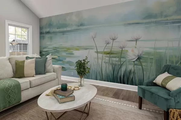 Valokuvatapetti Maisema järvellä, vesililjoilla ja lumpeenlehdillä, puita taustalla, rauhallisessa ympäristössä, vaaleansinisiä ja vihreitä sävyjä Nr w09395