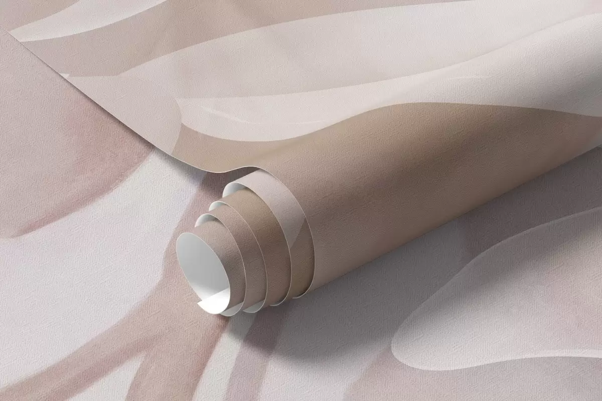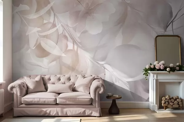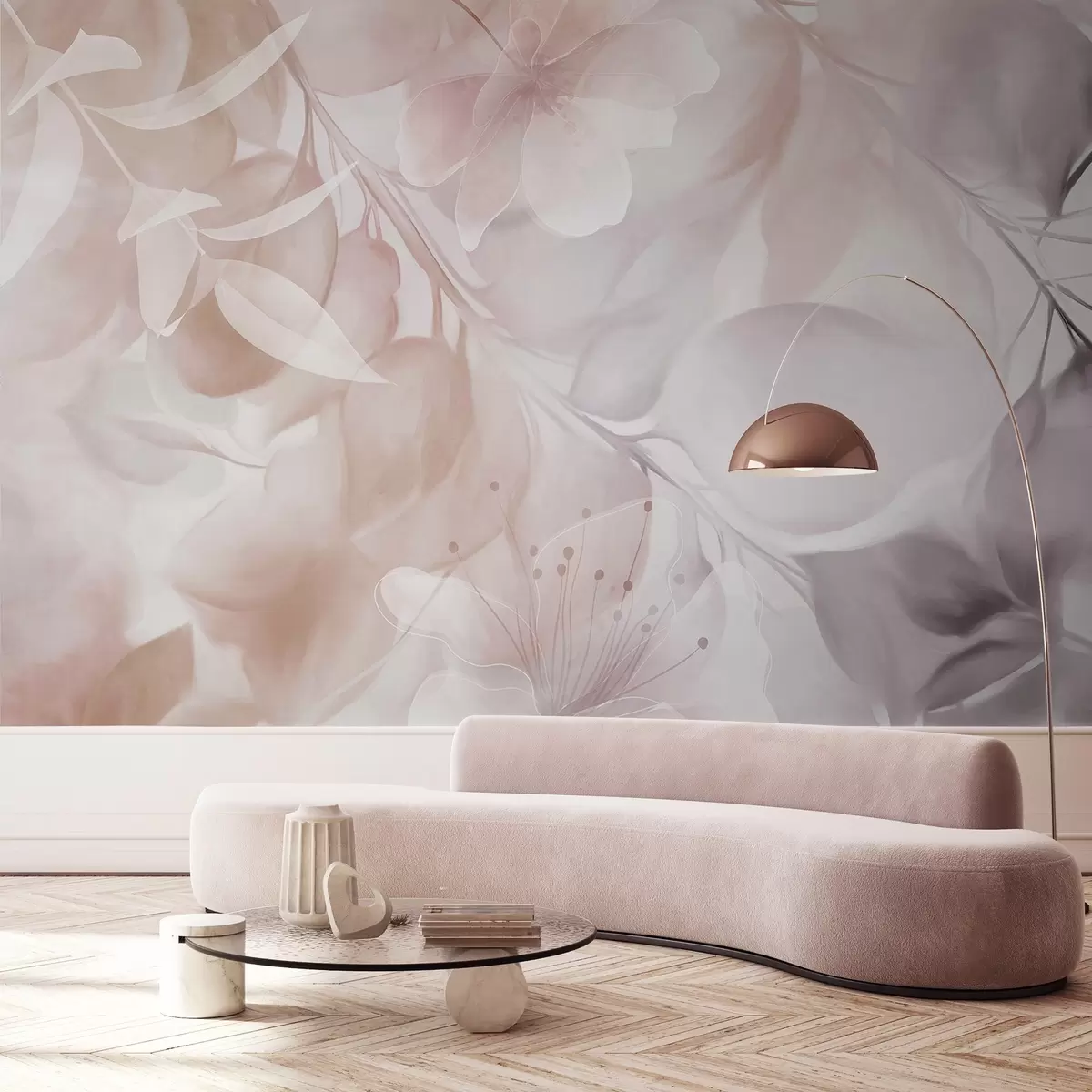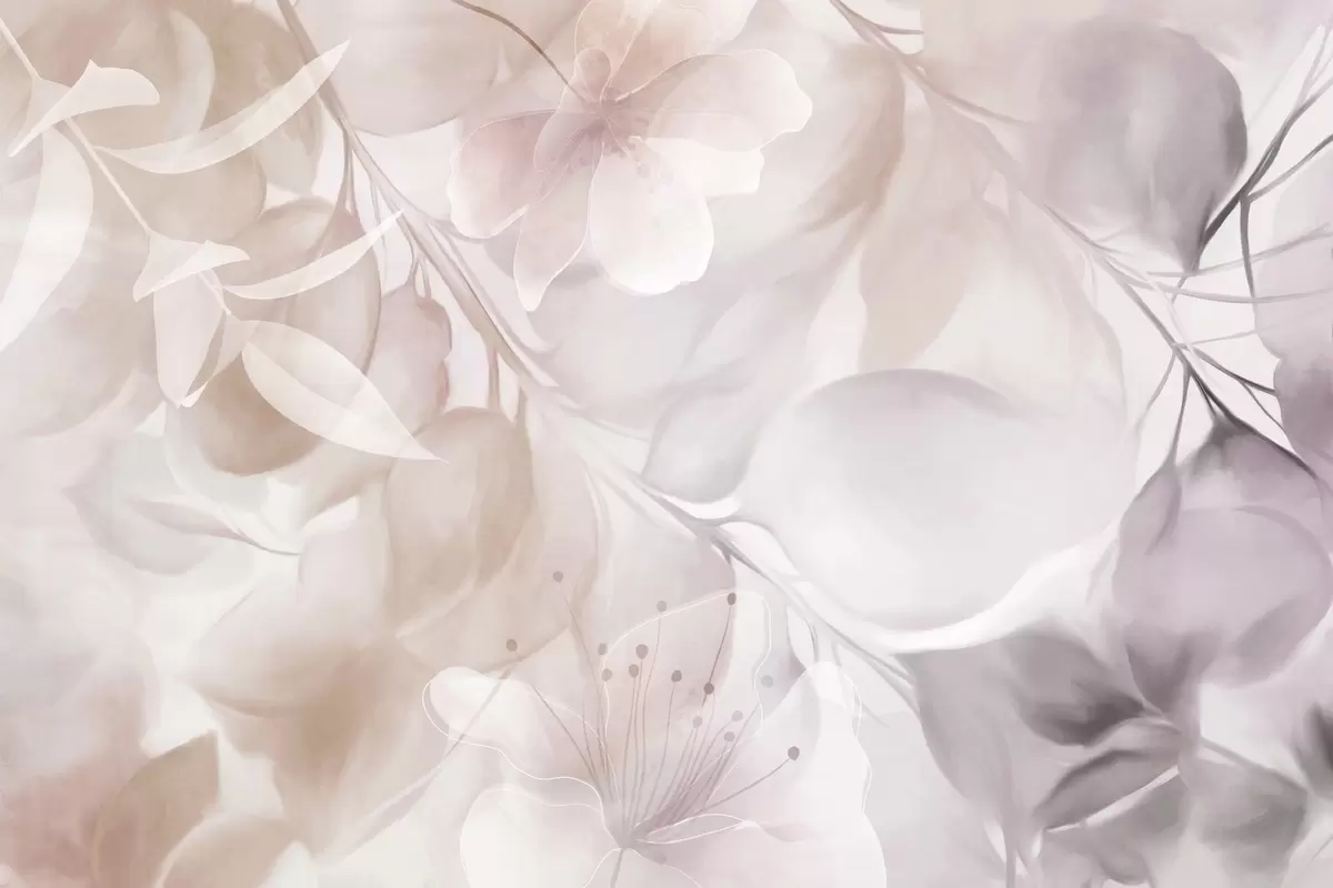 Valokuvatapetti Kukkataide, jossa on hillittyjä beigejä ja ruskeita kukkia, lehtiä ja oksia, pehmeitä pastellivärejä ja vesiväri-tekstuuri Nr w09397