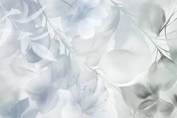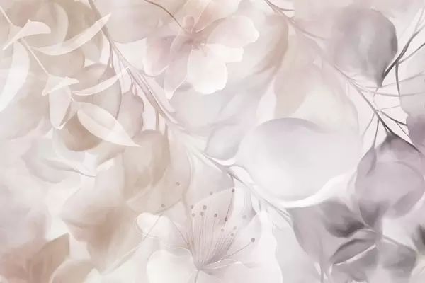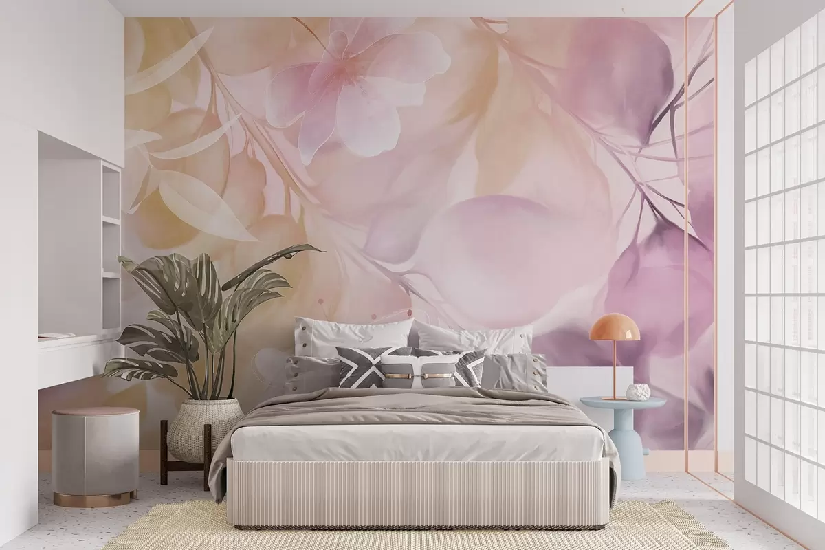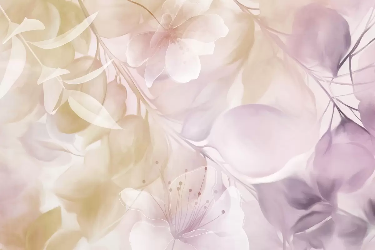 Valokuvatapetti Kukkataide, jossa on hillittyjä keltaisia ja violetteja kukkia, lehtiä ja oksia, pehmeitä pastellivärejä ja vesivärimaalauksen tekstuuria Nr w09397v2