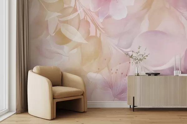 Valokuvatapetti Kukkataide, jossa on hillittyjä keltaisia ja violetteja kukkia, lehtiä ja oksia, pehmeitä pastellivärejä ja vesivärimaalauksen tekstuuria Nr w09397v2