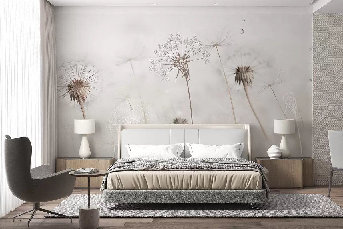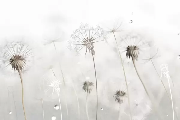 Valokuvatapetti Vesipisaroita sisältävät voikukat, valkoinen tausta, lähikuva, pehmeä valo, luonto, kasvitieteellinen, eteerinen, herkkä, minimalistinen Nr w09399