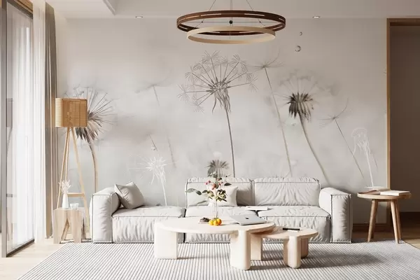 Valokuvatapetti Vesipisaroita sisältävät voikukat, valkoinen tausta, lähikuva, pehmeä valo, luonto, kasvitieteellinen, eteerinen, herkkä, minimalistinen Nr w09399