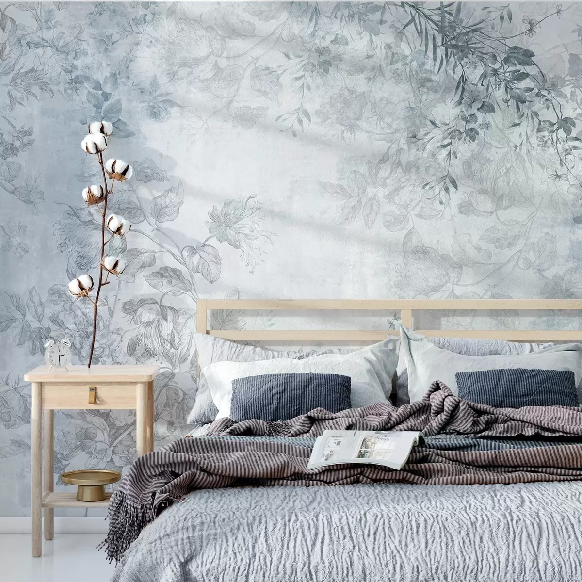 Valokuvatapetti Vintage-tyylinen kukkateos, jossa on piirustustyylisiä herkkiä puutarhakukkia ja lehtiä, pehmeät siniset sävyt Nr w09402v1