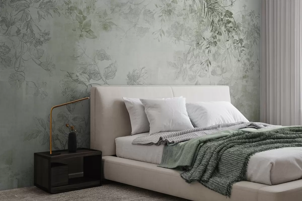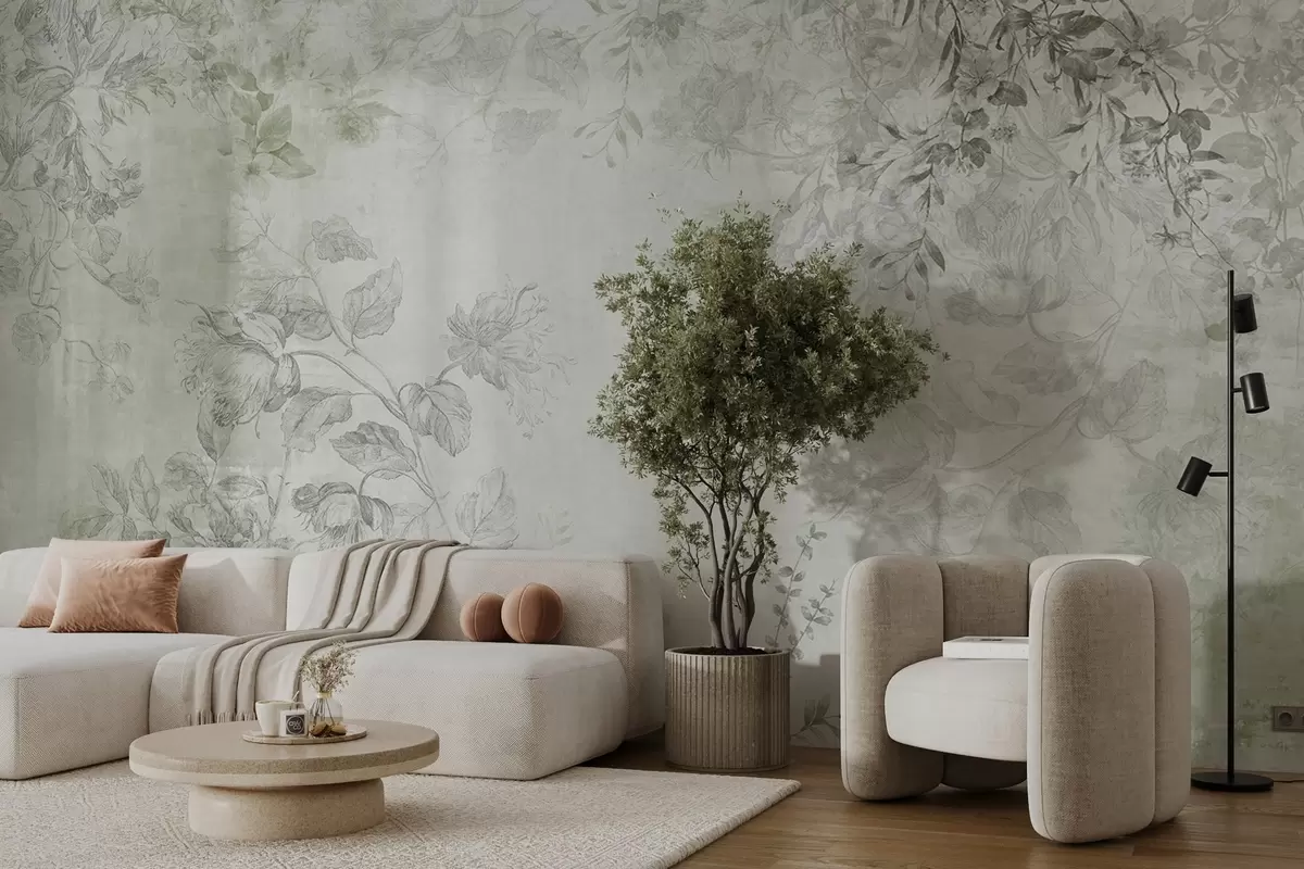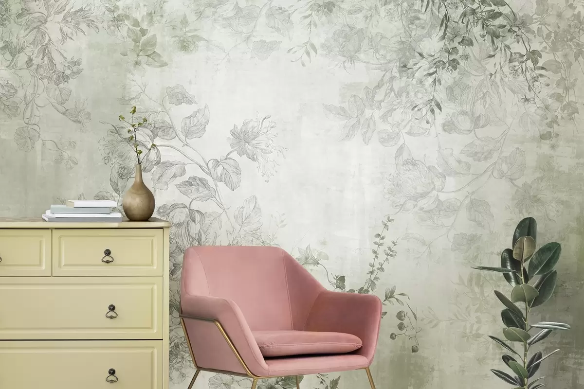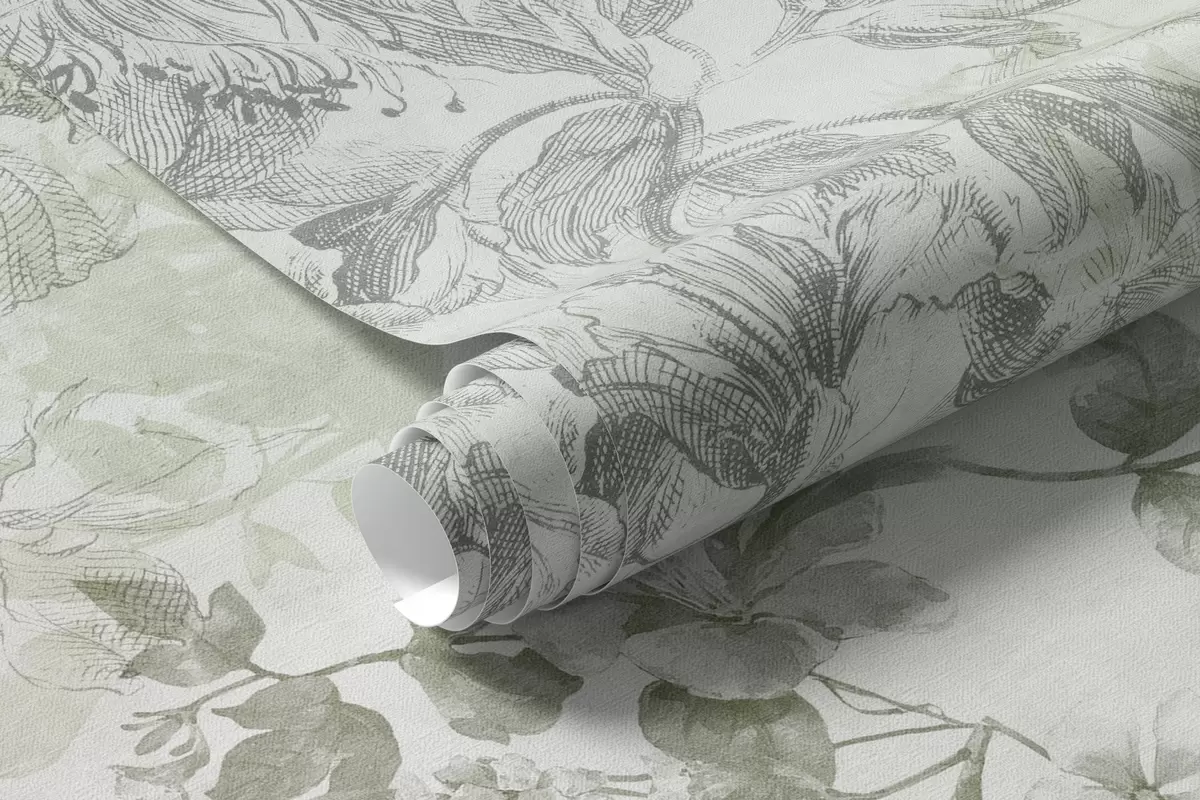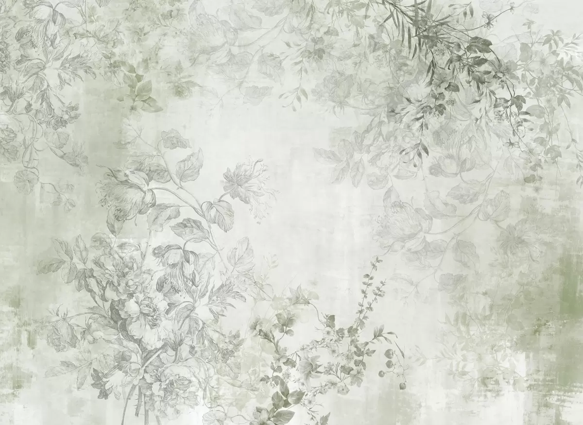 Valokuvatapetti Vintage-tyylinen kukkataide, jossa on piirustustyylisiä herkkiä puutarhakukkia ja lehtiä, pehmeät vihreät sävyt Nr w09402v2