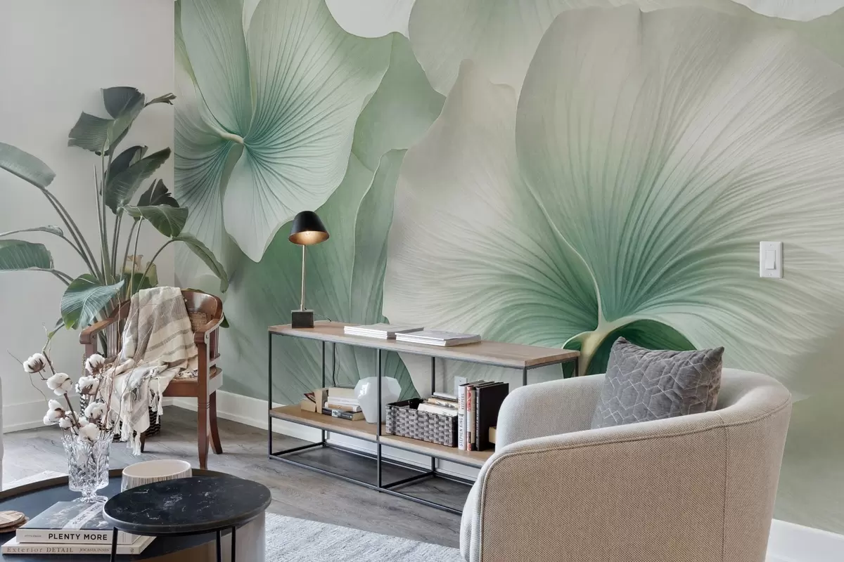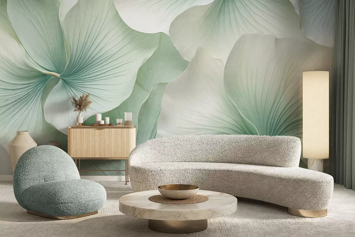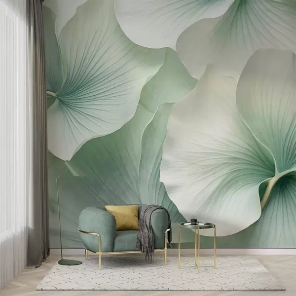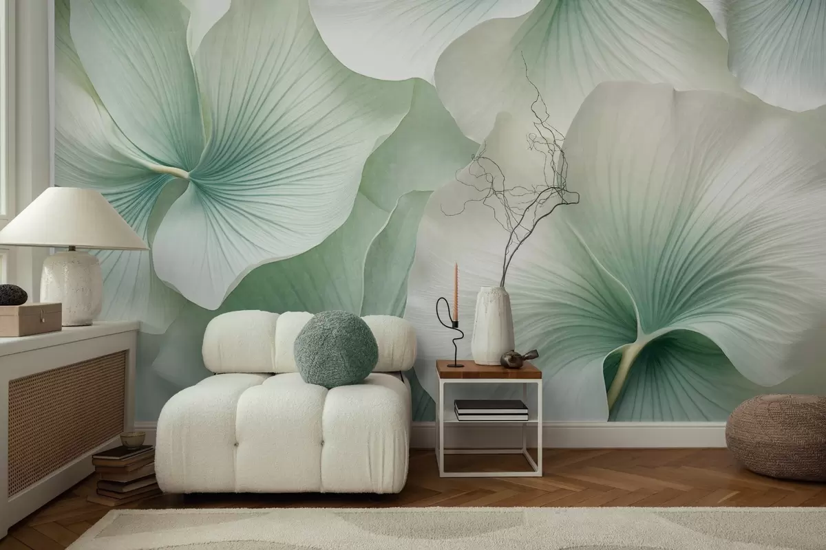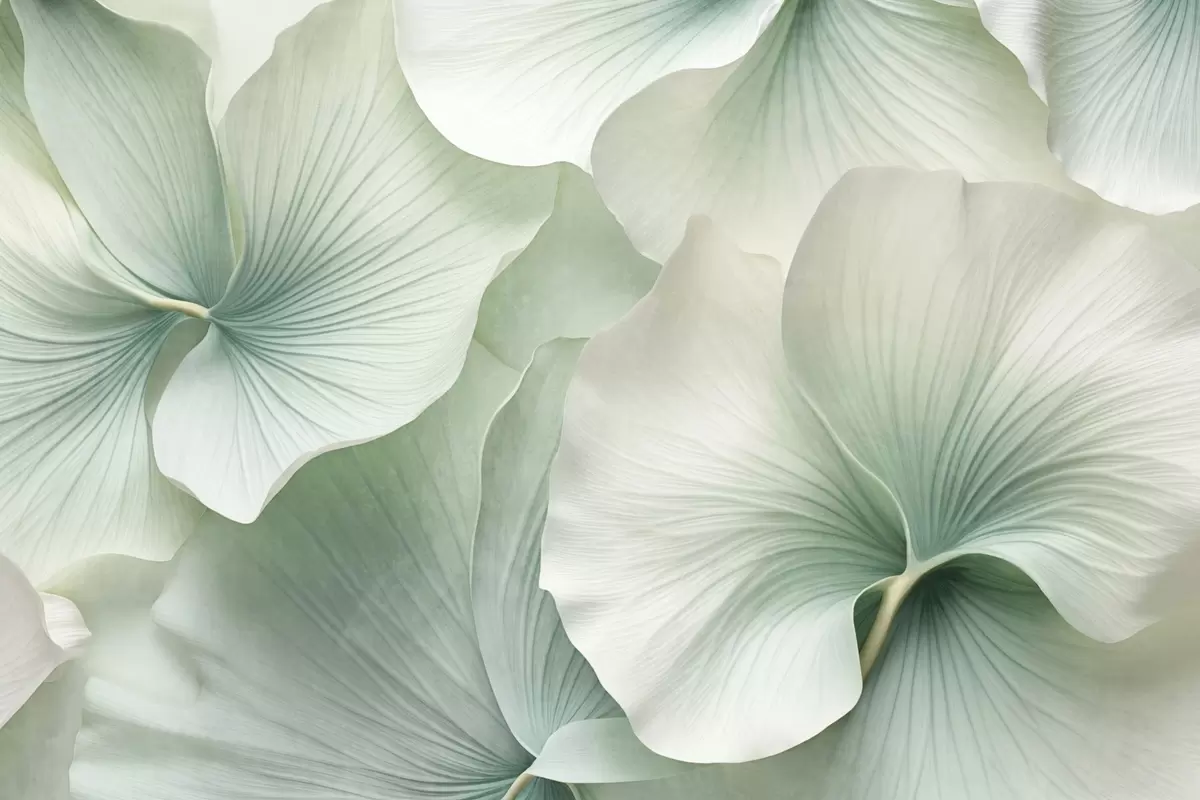 Valokuvatapetti Valkoiset ja vihreät ginkgo-lehdet, pehmeä tekstuuri, abstrakti kukkatausta, minimalistinen moderni tyyli Nr w09421