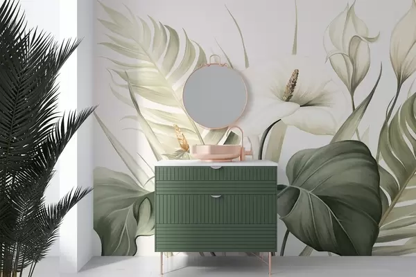 Valokuvatapetti Valkoiset kalla-liljat ja vihreät trooppiset lehdet, kasvitieteellinen piirros, vaalea tausta, vintage-tyyli, teksturoitu Nr w09423