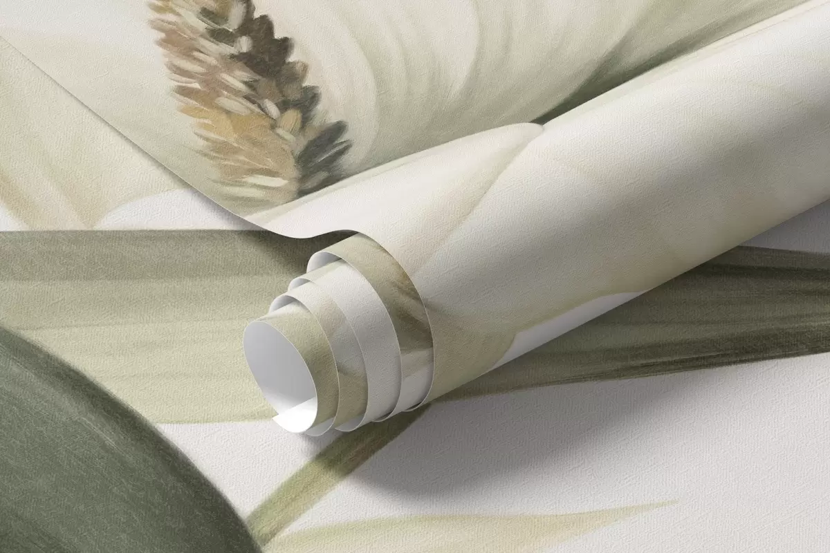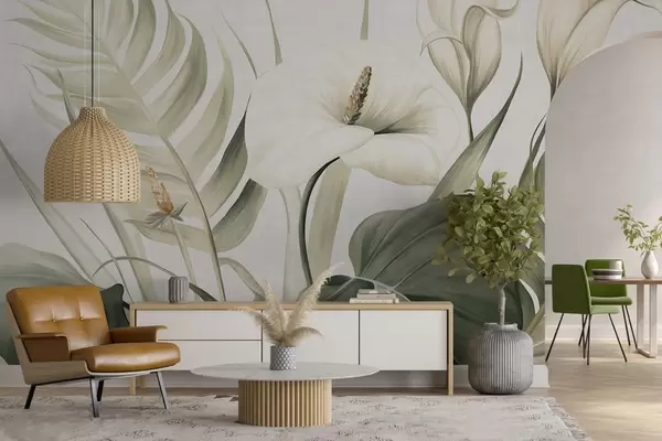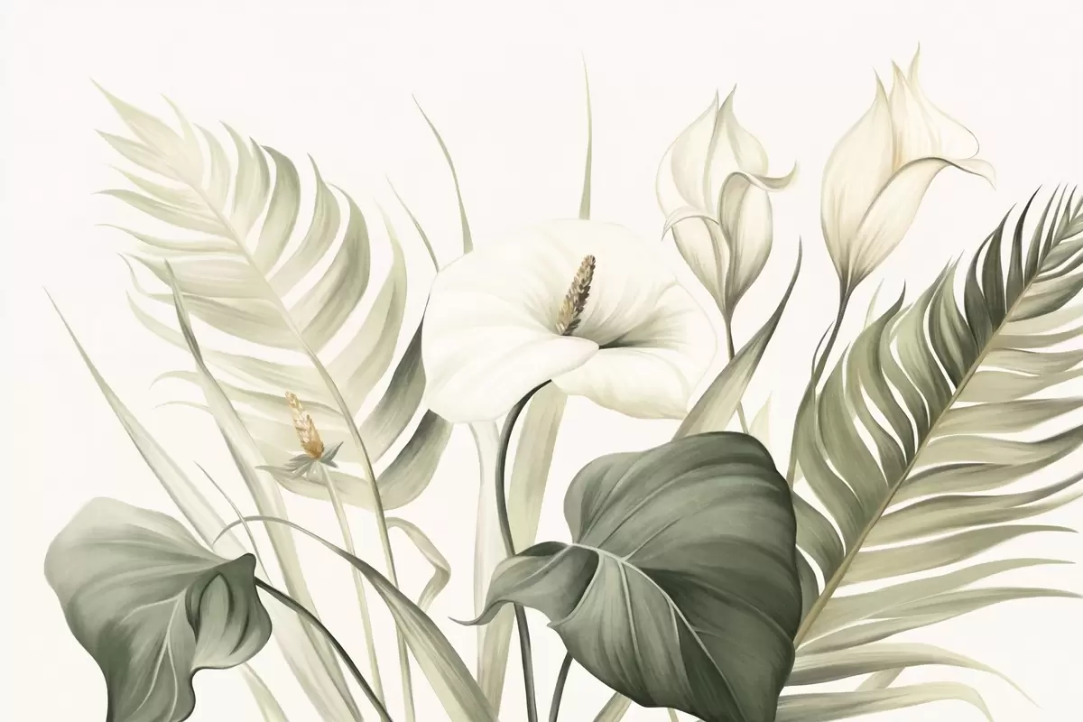 Valokuvatapetti Valkoiset kalla-liljat ja vihreät trooppiset lehdet, kasvitieteellinen piirros, vaalea tausta, vintage-tyyli, teksturoitu Nr w09423