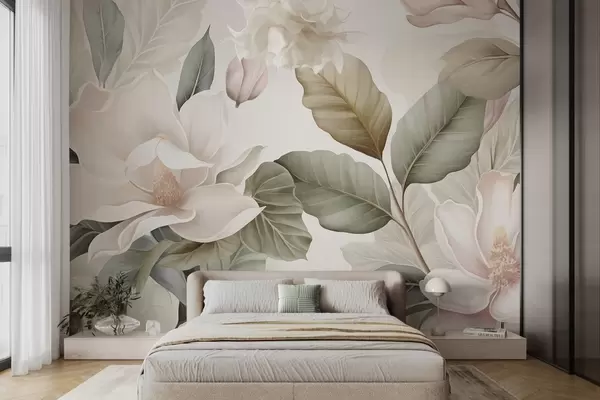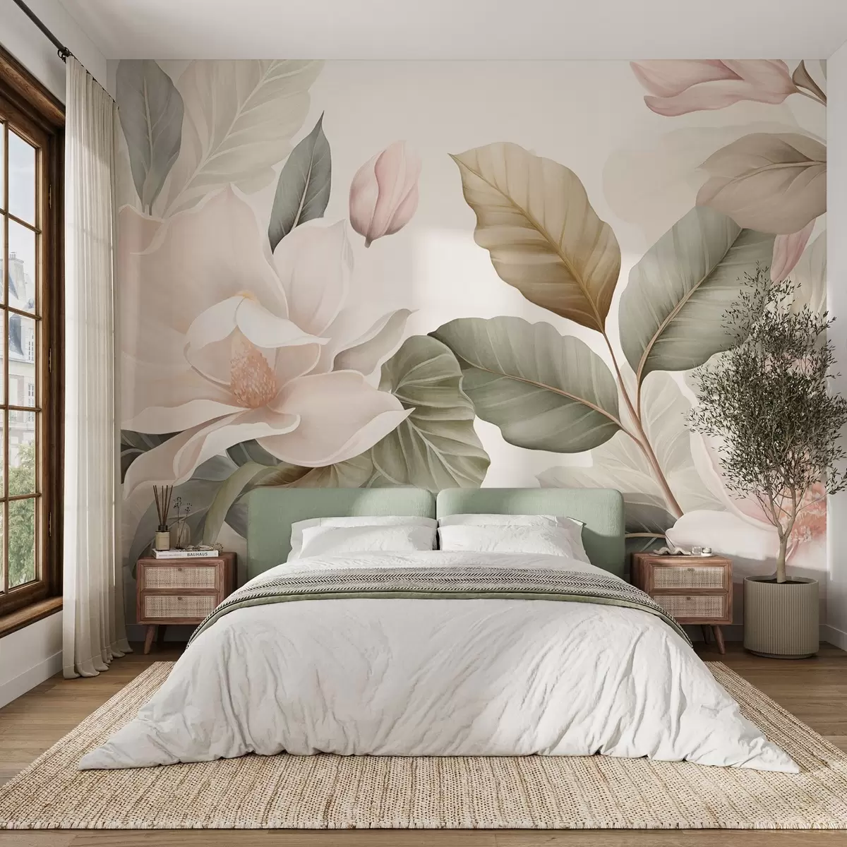 Valokuvatapetti Magnolian kukat pastelliväreillä, valkoisella, vaaleanpunaisella ja vihreällä, pehmeät, herkät, vesiväri-tyyliset Nr w09427