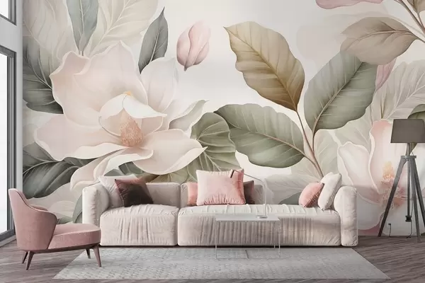 Valokuvatapetti Magnolian kukat pastelliväreillä, valkoisella, vaaleanpunaisella ja vihreällä, pehmeät, herkät, vesiväri-tyyliset Nr w09427