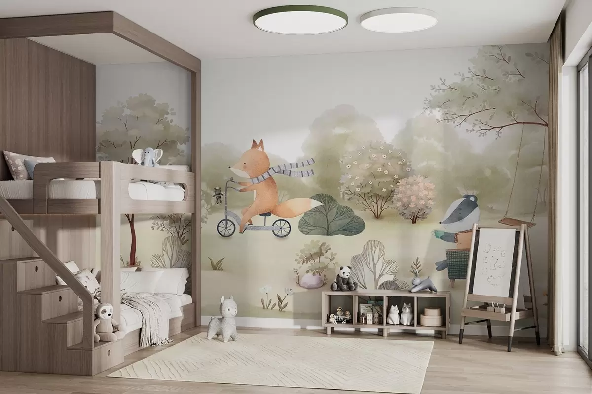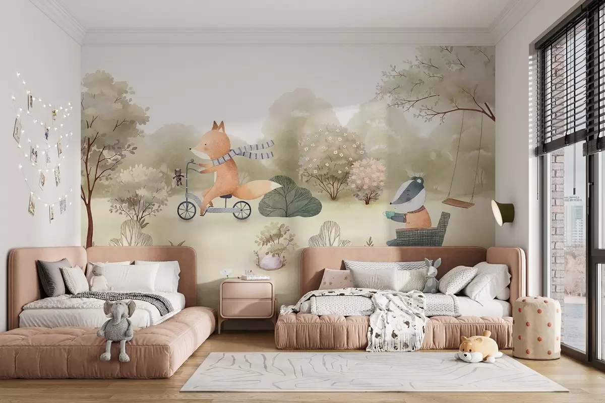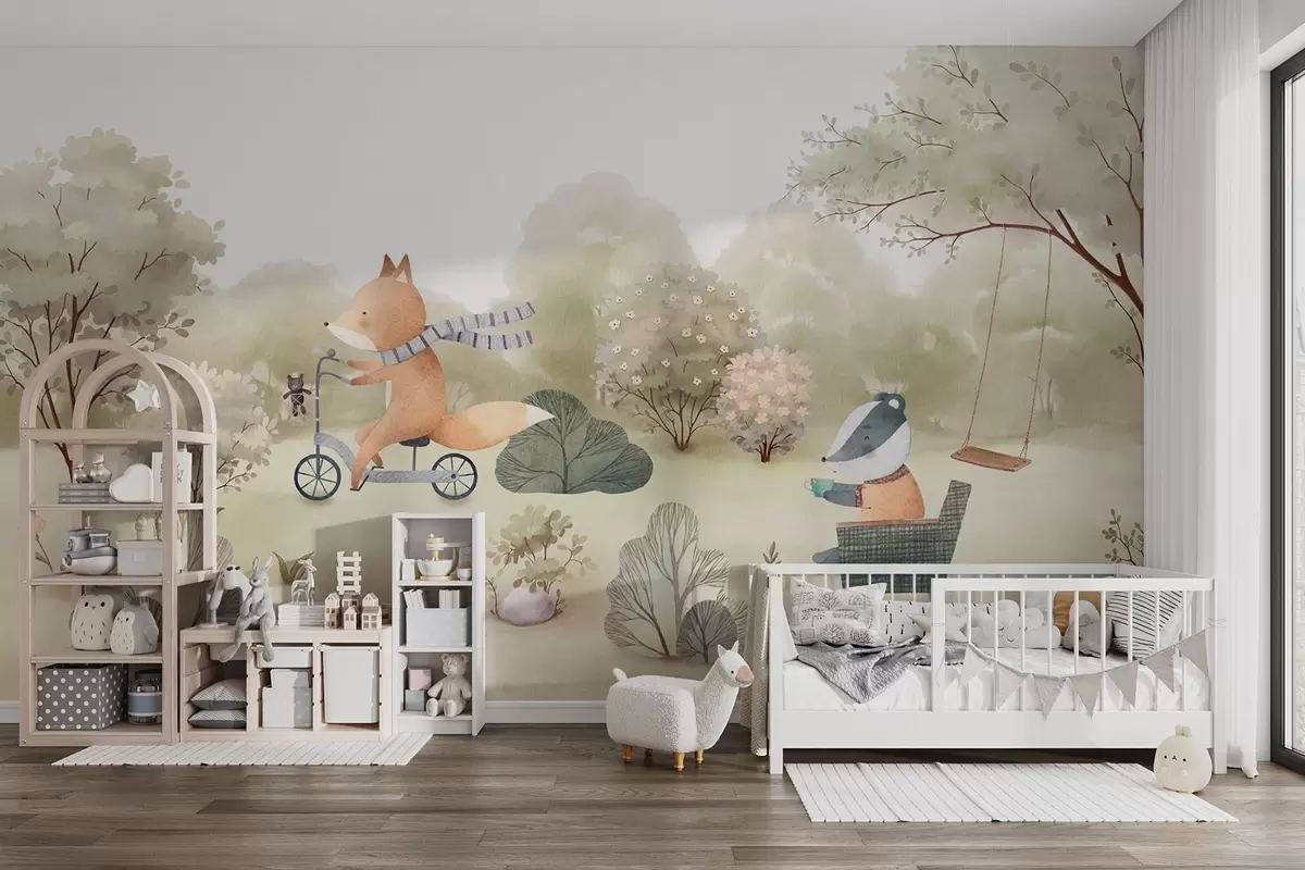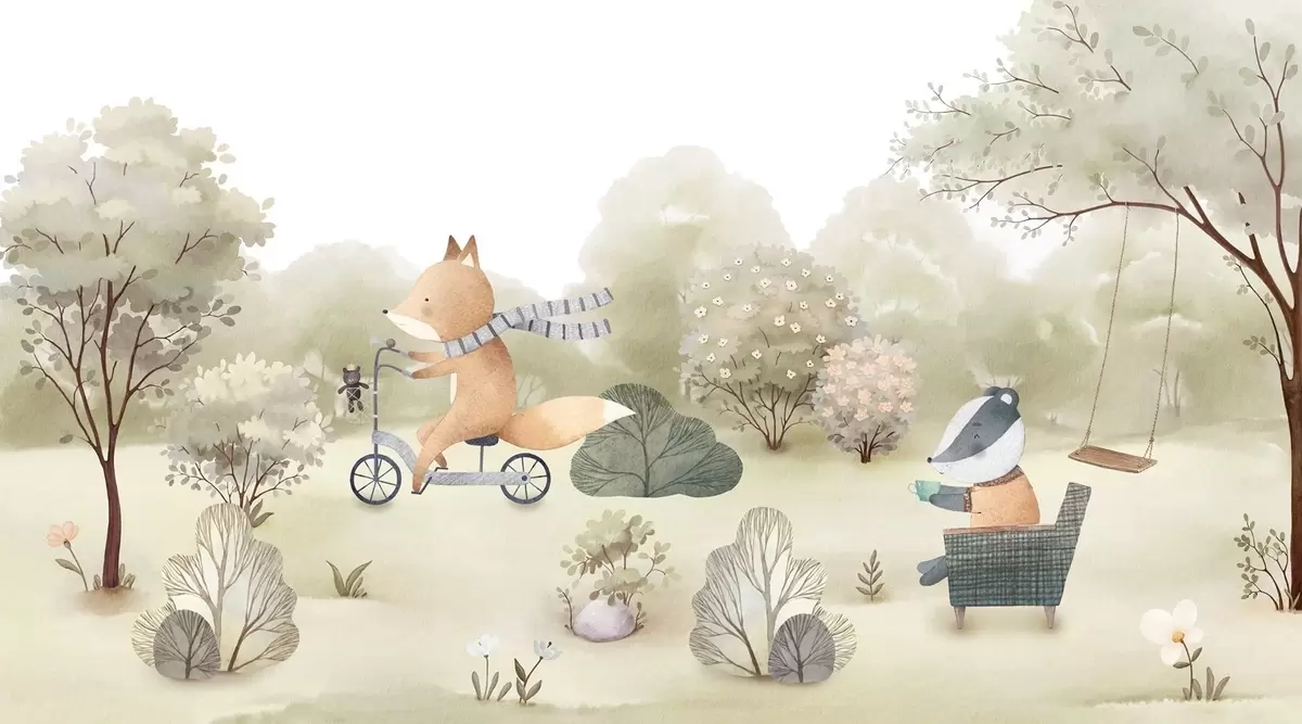 Valokuvatapetti Fox polkupyörällä ja mäyrä teetä juomassa, metsän eläimet vesiväri-tyylillä Nr w09439