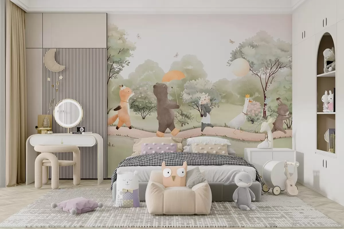Valokuvatapetti Pienten eläinten juhlava matka metsän läpi vesiväritekniikalla Nr w09440