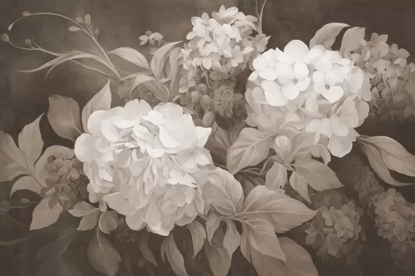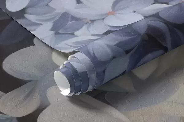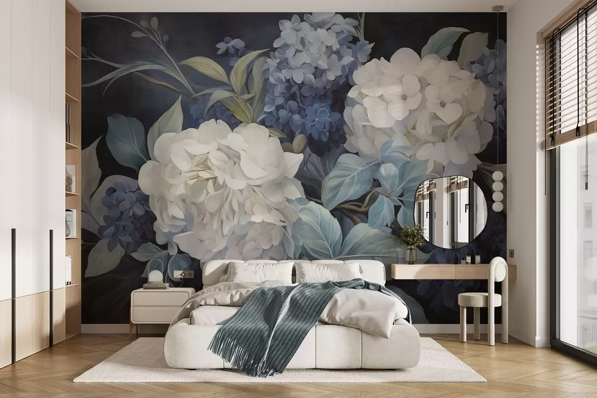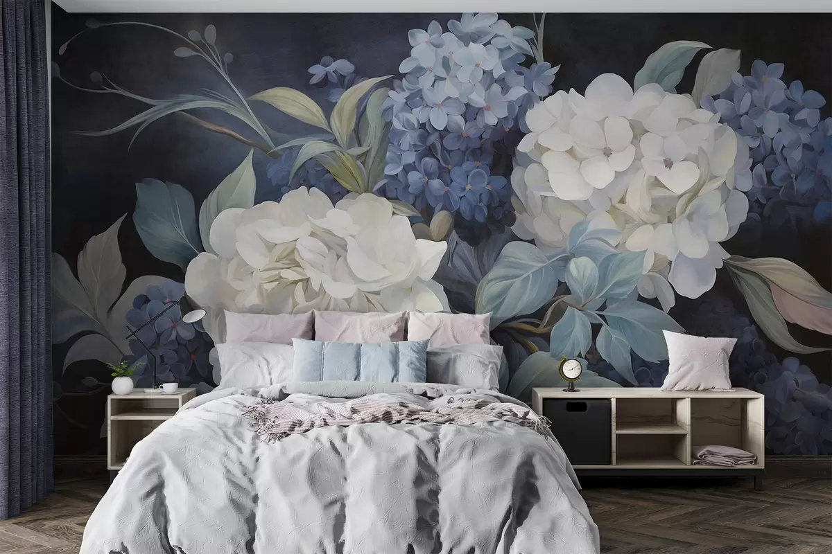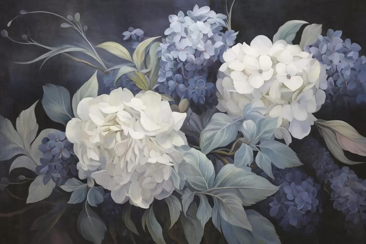 Valokuvatapetti Teksturoitu tummansininen maalaus, joka jäljittelee hydrangeakukkia suurine lehdineen, abstrakti ja tumma tausta Nr w09465v1